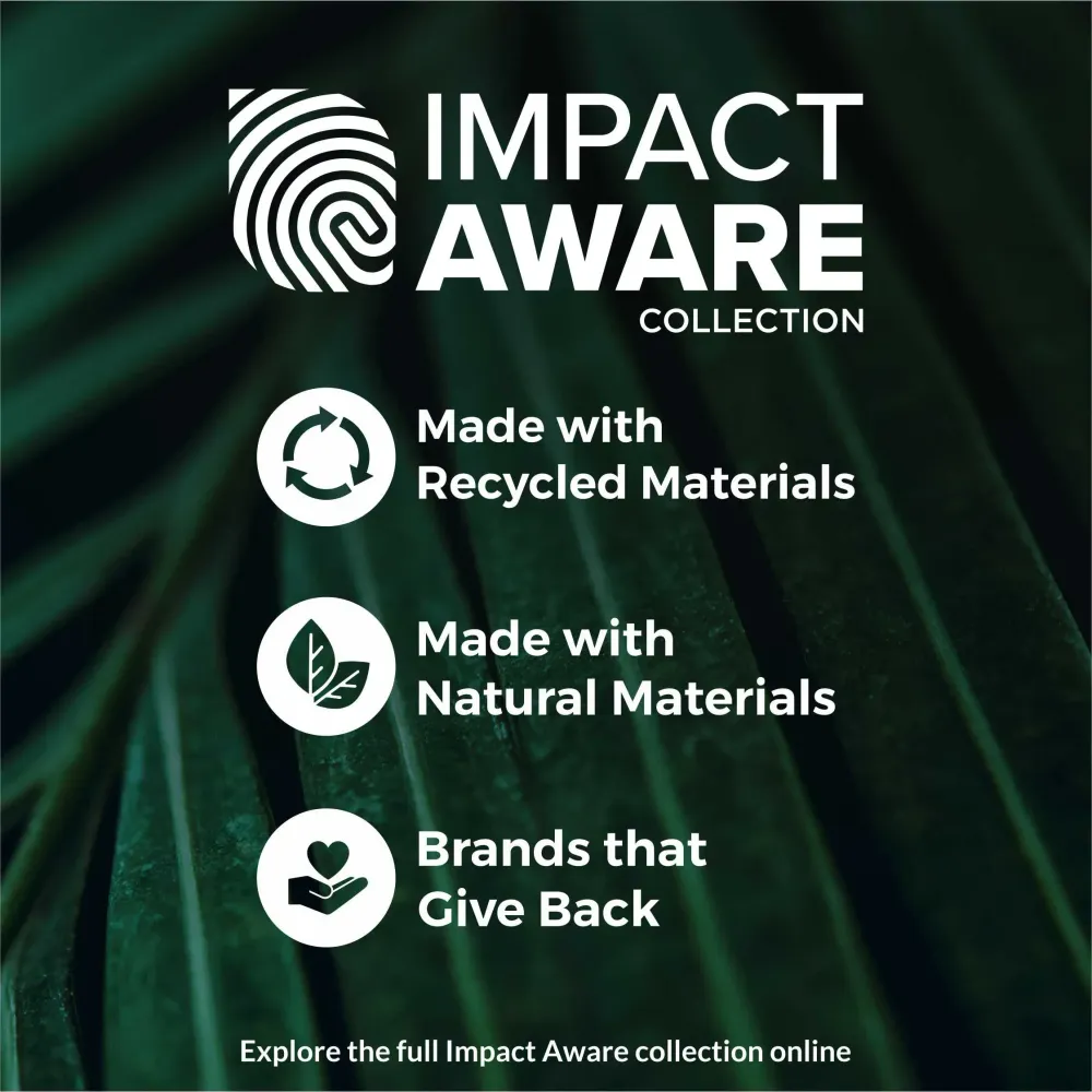 Impact Aware highlights products selected for a lower-impact profile. Each item in the range meets at least one of three criteria—using recycled inputs, drawing on natural materials, or partnering with brands that return value to people or the planet. You’ll also see an Impact Aware icon on the main product image, making it easy to spot eligible items at a glance.