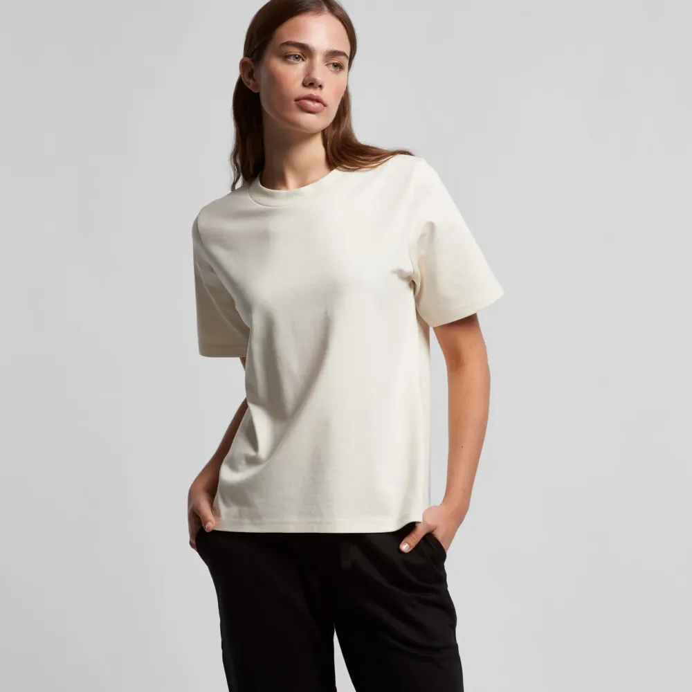 The Women’s Heavy Tee (4080) pairs a relaxed, boxy silhouette with dropped shoulders for a contemporary look. Built from heavy 280 GSM, 26-doubles 100% carded cotton, it offers structure and durability with a smooth print surface. Wide neck ribbing, side seams and double-needle hems help the tee hold its shape, and the fabric is pre-shrunk to help minimise shrinkage after washing.