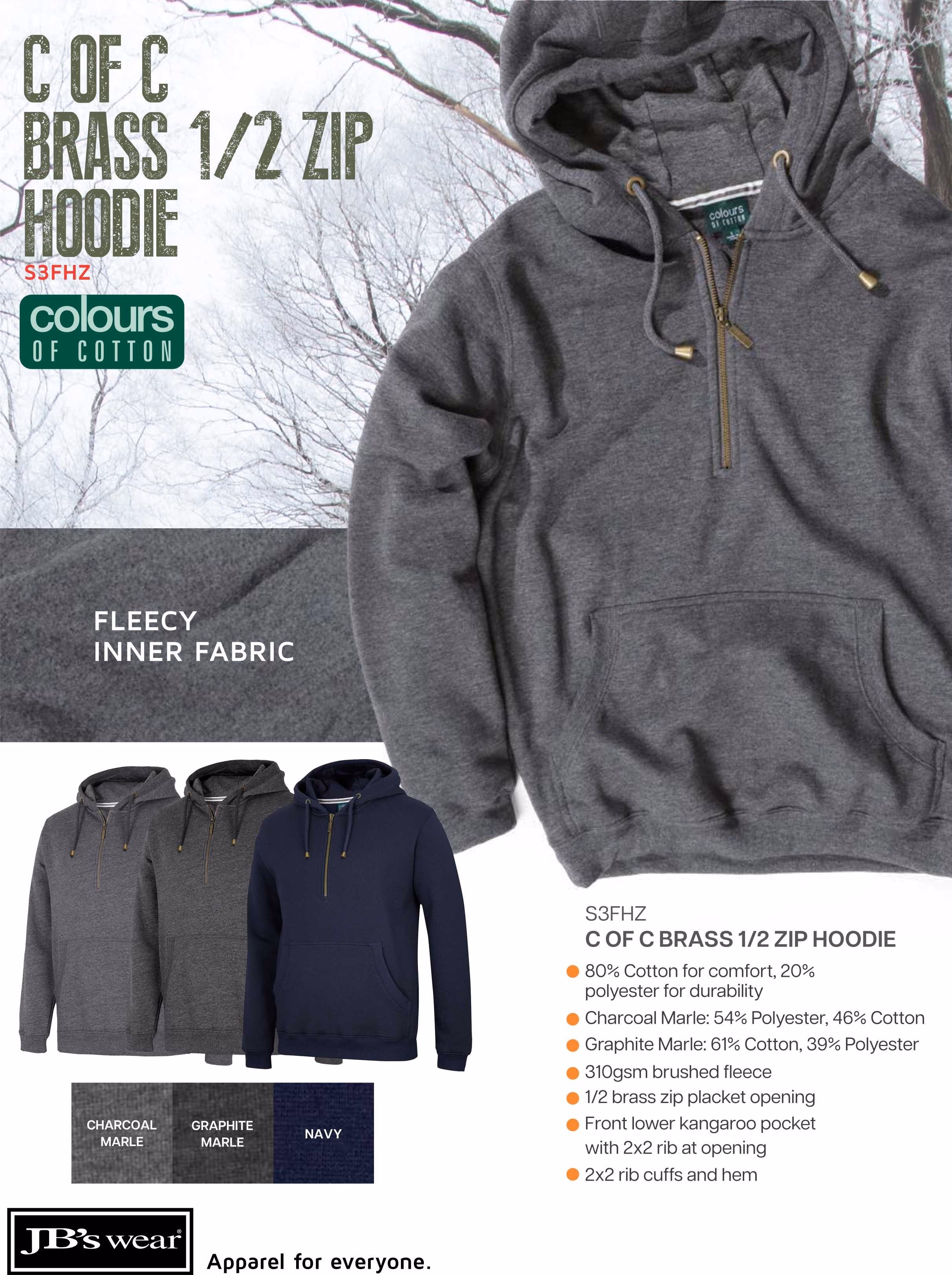 A warm half zip hoodie in an urban fit, made from 310 GSM brushed fleece with a cotton and polyester blend. It features a brass 1/2 zip placket for ventilation, a front lower kangaroo pocket and tidy rib trims at the cuffs and hem.