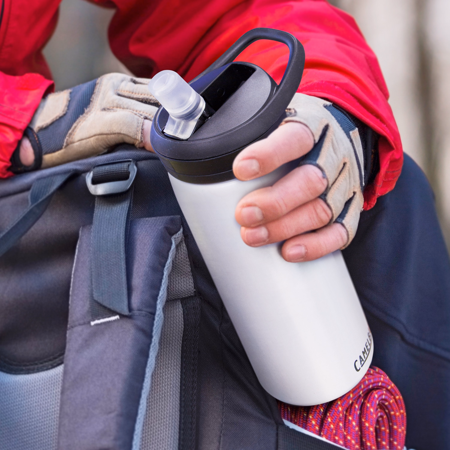 CamelBak Eddy+ is a 600 ml stainless steel bottle engineered for reliable cold performance with double-wall vacuum insulation rated to keep drinks cold for up to 24 hours. The secure screw-on universal cap is leak-proof when closed and spill-proof when open, and integrates a comfortable carry handle. Its redesigned medical-grade silicone bite valve and straw system deliver 25% more water per sip, helping users hydrate efficiently during the day. The bottle features the CamelBak logo printed on the body and debossed on the lid, reinforcing the brand’s quality cues. A tough powder-coated exterior supports everyday use and fits most cupholders. Custom decoration is available via rotary screen print or laser engraving (etches to a shiny steel finish). Backed by CamelBak’s Got Your Bak™ lifetime guarantee.
