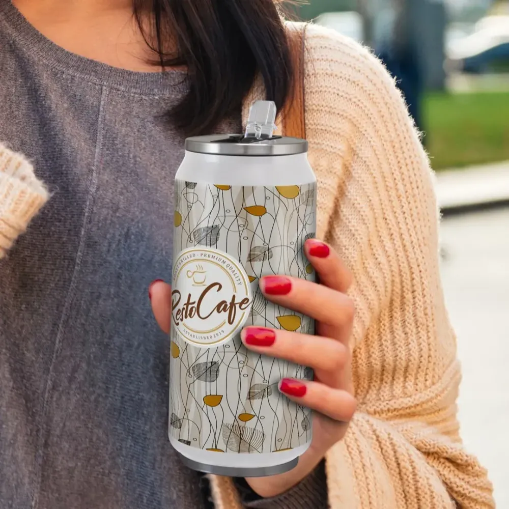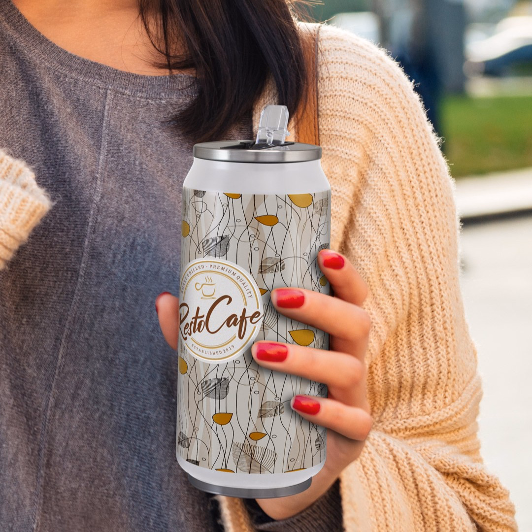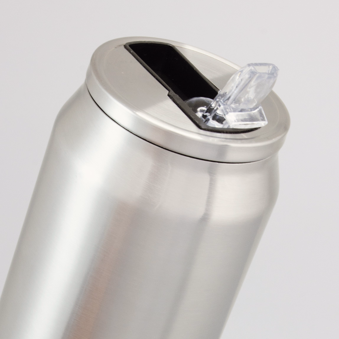 Canister is a 450 ml stainless steel vacuum bottle with a distinctive can-shaped design. It has double-wall vacuum insulation and a secure screw-on stainless steel lid with a flip-out drinking valve and straw. The white version has a gloss painted finish, the black version is matte painted, and the silver option shows a shiny steel surface. Branding is offered via pad print, rotary screen print, rotary digital full colour print, or laser engraving. Engraving produces a shiny steel finish on coloured bottles and a natural etch on the silver version. Canister is BPA-free and presented in an individual black gift box. Hand washing is recommended to maintain decoration.