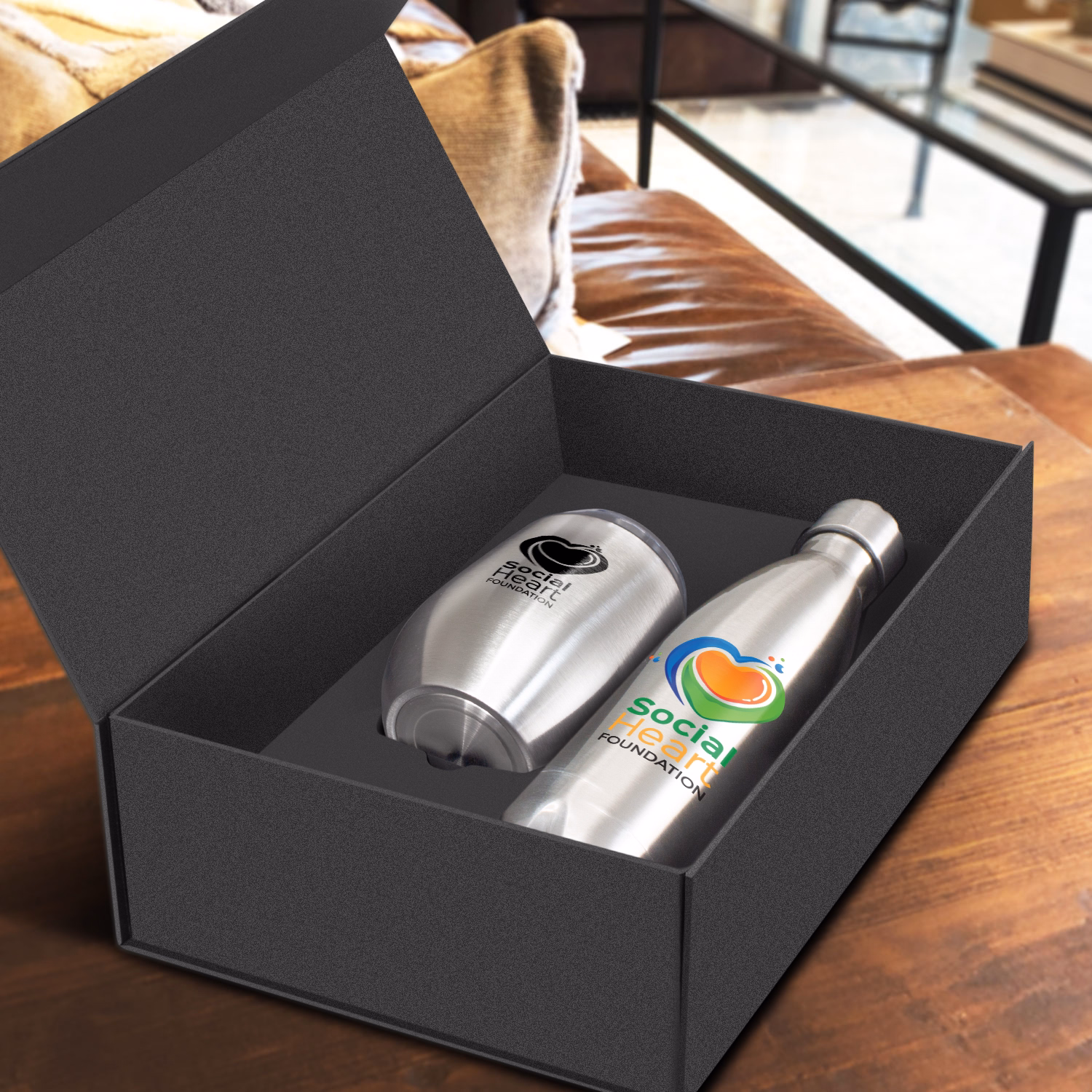 The Cordia Vacuum Gift Set combines a 500 ml Mirage Vacuum Bottle and a 300 ml Cordia Vacuum Cup in a single premium presentation. Both items are crafted from stainless steel with double-wall vacuum insulation to ensure long-lasting temperature retention. Mirage keeps drinks cold for up to 24 hours or hot for 12, while Cordia holds heat for up to 3 hours. The powder coated finish provides durability and a professional look, with silver options supplied in shiny steel. Both items are BPA-free and engrave to a shiny steel finish (or natural etch for silver). The set is presented in a choice of black or natural gift box, making it an ideal branded gift.