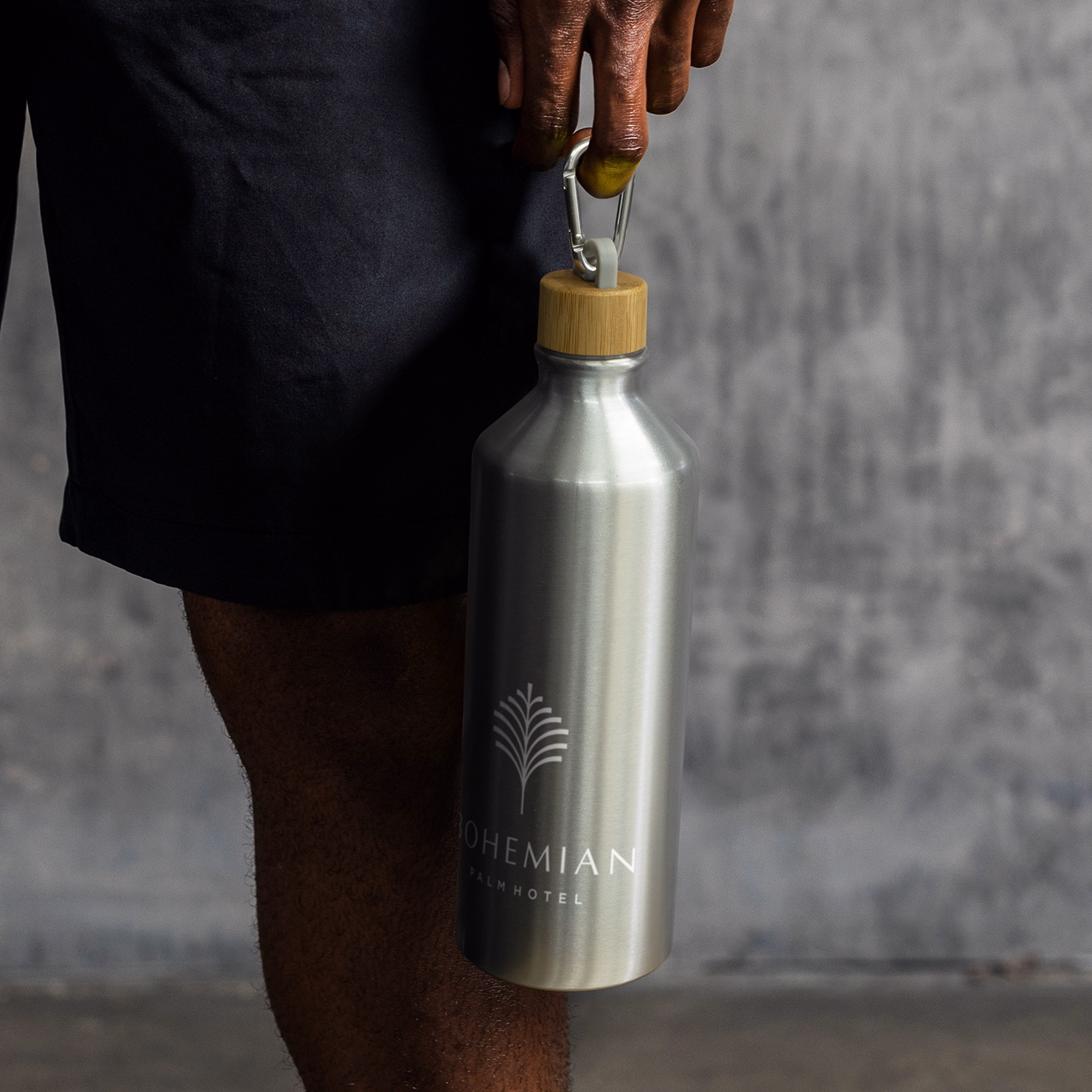 Dante is a lightweight 750 ml aluminium bottle fitted with a bamboo screw-on lid. The lid has a polypropylene inner and a silicone seal for dependable closure. An aluminium carabiner is integrated with the lid for attachment or carrying. The construction is BPA-free and supplied loose packed, with an optional natural gift box and sleeve available. Branding methods include pad print, rotary screen print, and vivid full-colour rotary digital print. Hand washing is recommended to preserve printed graphics.