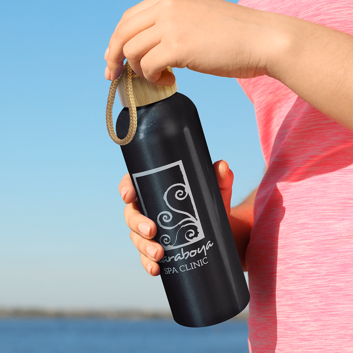 Eden is a 600 ml single-wall aluminium bottle with a painted exterior. It is fitted with a secure bamboo screw-on lid, which has a polypropylene inner and a silicone seal. Silver presents a polished steel look, while colour options are painted for a clean finish. The BPA-free construction supports safe use. Branding can be applied via pad print, rotary screen print, or vivid full-colour rotary digital print. For presentation, optional packaging includes a natural gift box or printed gift box sleeve. The bottle should be hand washed to protect printed branding.