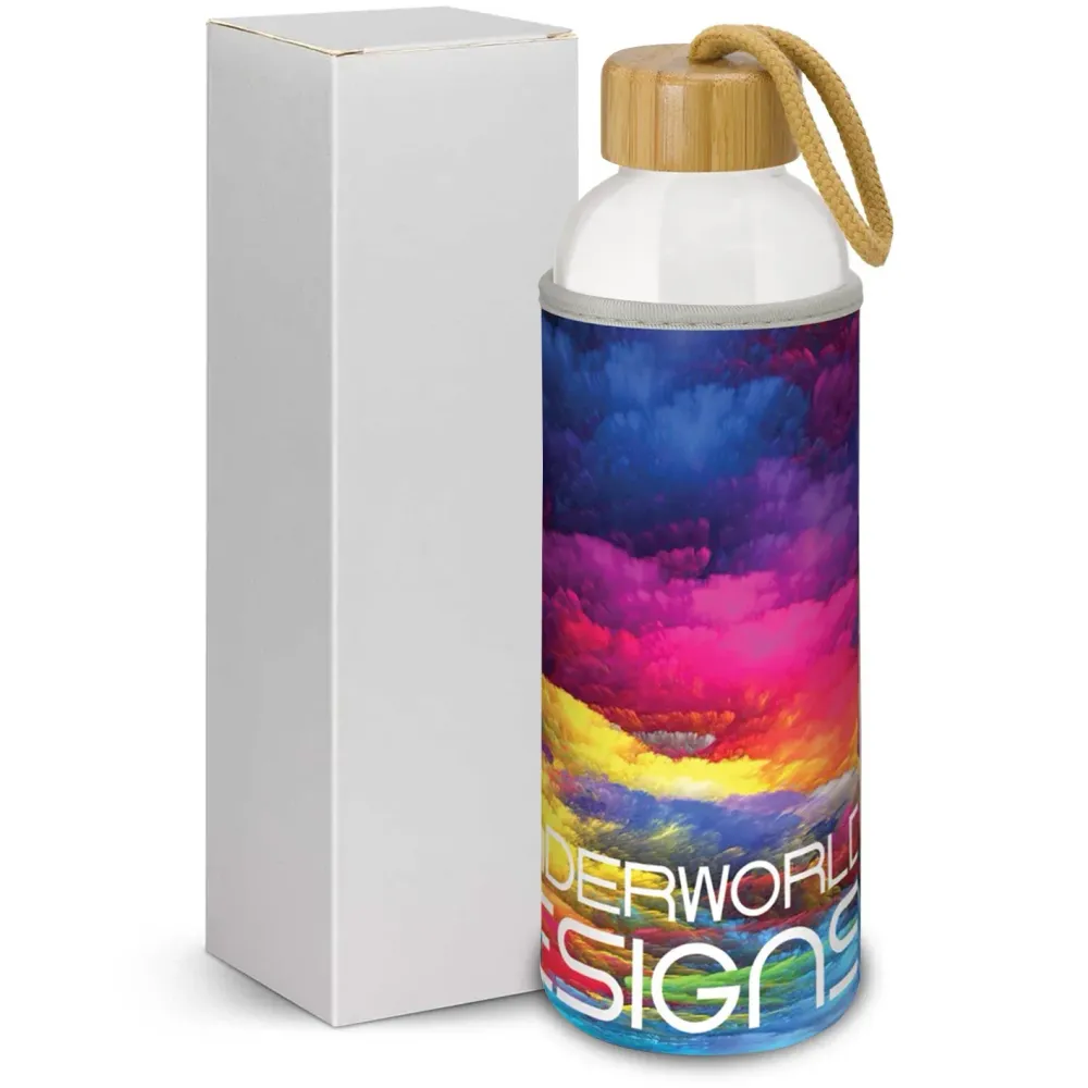 Eden is a sophisticated 600ml borosilicate glass drink bottle with a soft neoprene sleeve that helps keep drinks cool. The on-trend bamboo lid includes a matching braided carry handle, and the sleeve features matching binding. Both the sleeve and base can be branded in stunning full colour for standout presentation. Borosilicate glass is lightweight, exceptionally strong and shatter-resistant, delivering reliable everyday use. Glass provides a clean, pure taste and a safe, BPA-free alternative to single-use plastic. A production lead time of 25 working days applies to the sleeve. This bottle is not dishwasher safe; handwashing is recommended, and bamboo grain and colour may vary naturally.