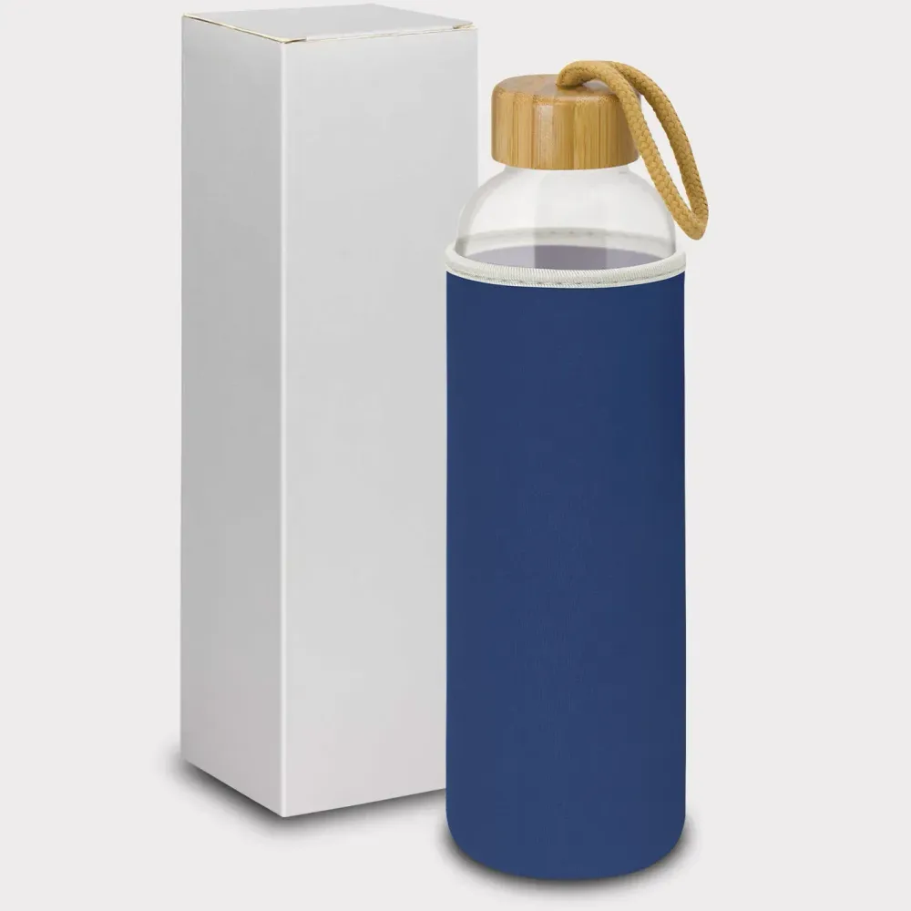 Eden is a sophisticated 600ml borosilicate glass drink bottle with a soft neoprene sleeve. The insulating sleeve helps keep drinks cool while adding protection. A trendy screw on bamboo lid with a braided carry handle makes daily carry easy. Glass delivers a clean, pure taste and is a safe, reusable alternative to plastic. Use for cold liquids only; it is not suitable for hot or carbonated drinks. Each bottle is presented in a white gift box, with an optional gift tube available. Hand washing is recommended; the bottle is not dishwasher safe, and bamboo may vary naturally.