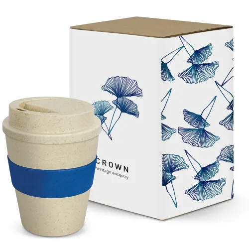 Single-wall construction uses a 50/50 blend of rice husk fibre and BPA-free polypropylene. A secure screw-on lid with a flip closure supports easy sipping. The heat-resistant silicone band improves grip and defines a clear branding area. The cup and lid are natural, with band colours available to coordinate. Branding includes pad print on the cup or band, rotary screen print on the band, silicone digital on the band, and debossing. An optional natural gift box is available, with digital print on the box or sleeve. Hand washing is recommended to protect the cup and decoration.