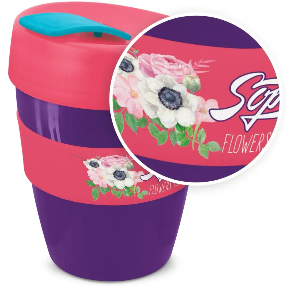 A single-wall polypropylene build keeps weight low and handling straightforward. The screw-on lid features a splash-resistant flip closure for controlled sipping. A heat-resistant silicone band improves grip and defines a clear branding area. The design is colour-customisable: mix cup, lid, flip piece, and band to match palettes. Branding includes pad print on the cup or lid, plus band decoration via pad print, large wrap screen, silicone digital, or debossing. An optional natural gift box and printable sleeve complete the presentation. Hand washing is recommended to preserve decoration.