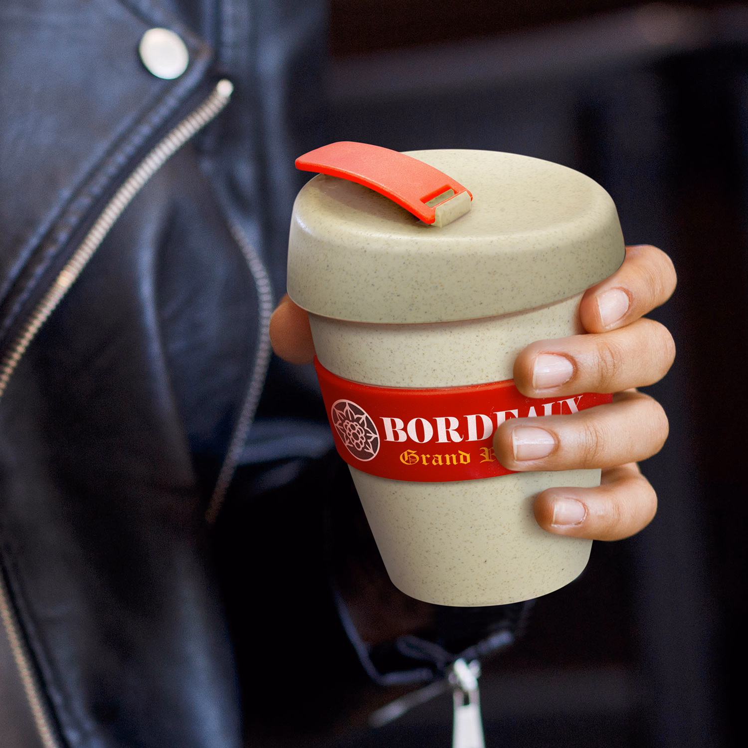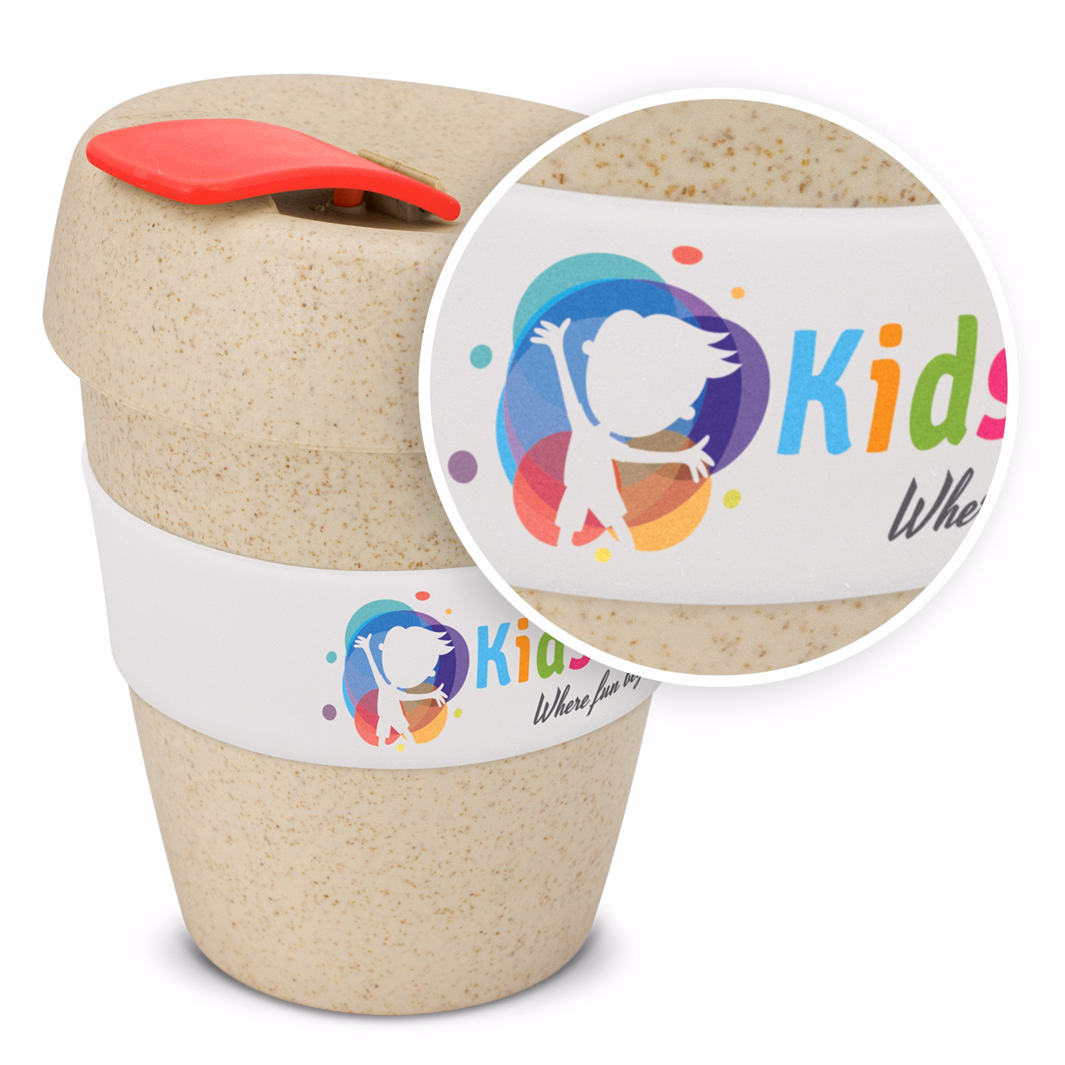 This natural-look cup uses a 60/40 blend of BPA-free polypropylene and rice husk fibre. A secure screw-on lid with a flip closure supports controlled sipping. The matte natural body pairs with a soft silicone band for a clean, practical profile. Customise the presentation by mixing the band and flip-piece colours to suit your palette. Branding options cover the cup, lid and band with methods tailored to each surface. An optional natural gift box and printable sleeve are available. Hand washing is recommended to protect materials and decoration.