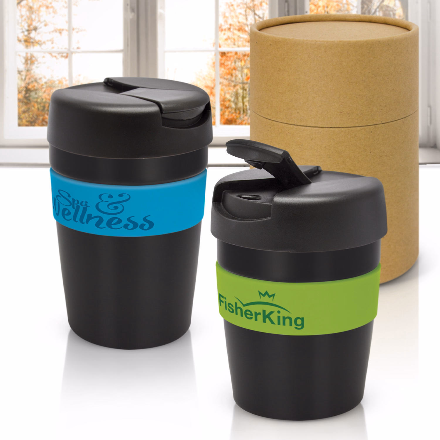 Vacuum-insulated stainless steel keeps coffee hot and the exterior comfortable. A screw-on flip-closure lid provides secure, splash-resistant use. The matt black finish and soft-touch band create a premium look. Cup and lid are black; bands come in fourteen colours. Branding on the band includes pad print, large wrap screen, or silicone digital. Debossing on the band is available; pad print on the cup, too. Optional gift tube branding is offered.