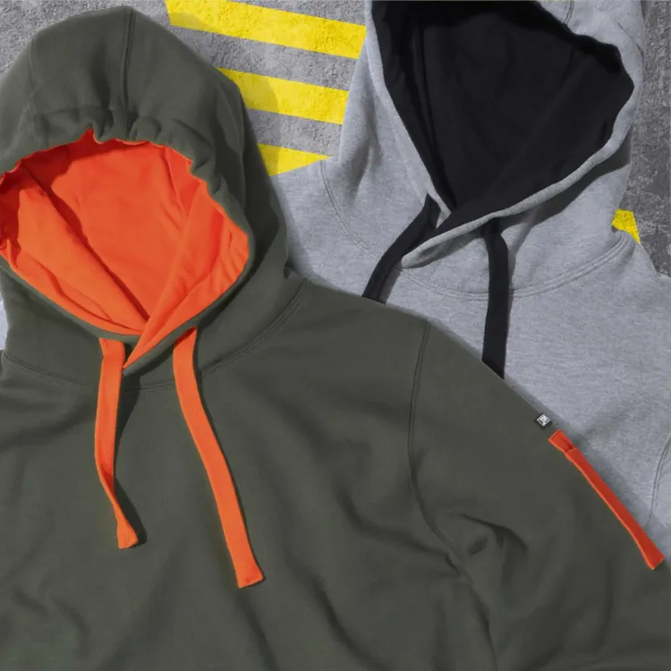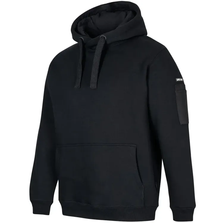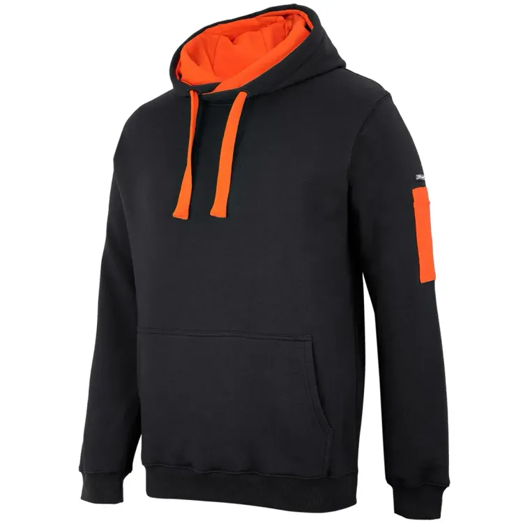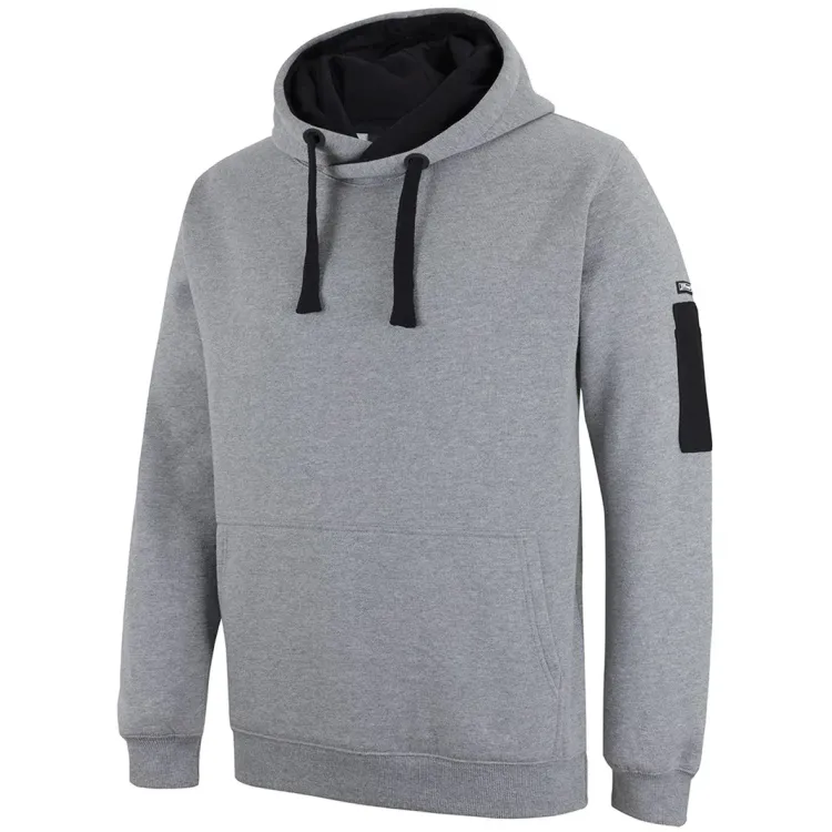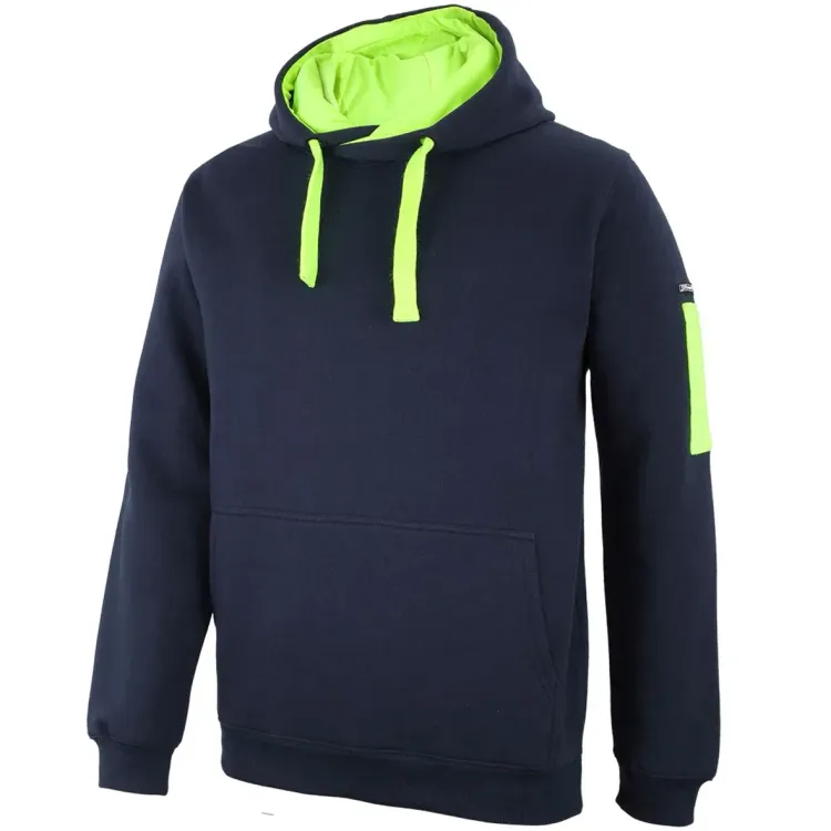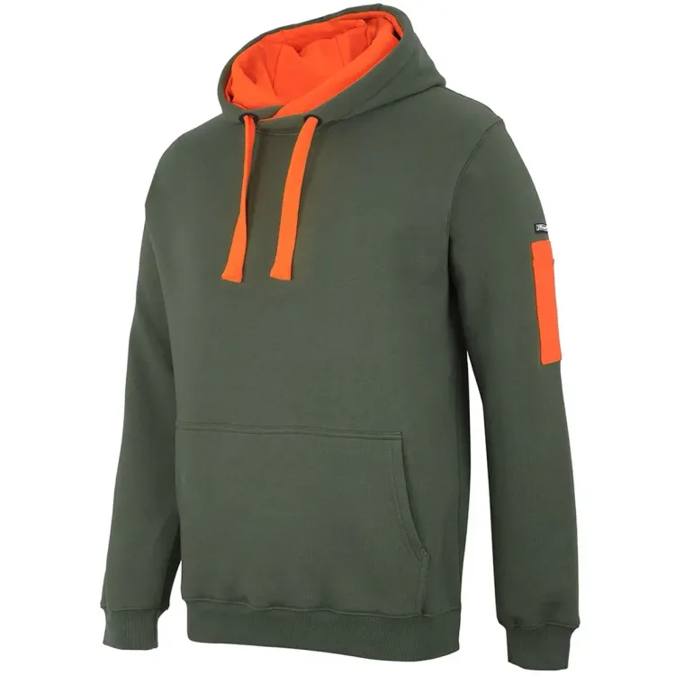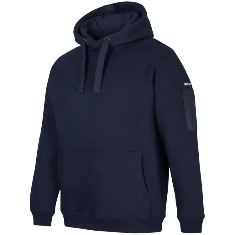 - Construction features: Fully lined jersey hood with drawcord, kangaroo pocket at centre front, pen pocket on left sleeve, rib cuffs and hem