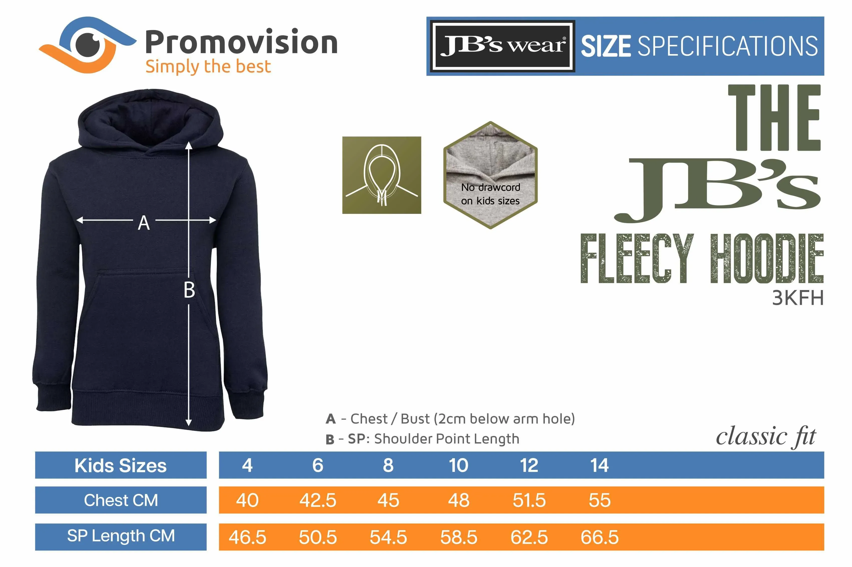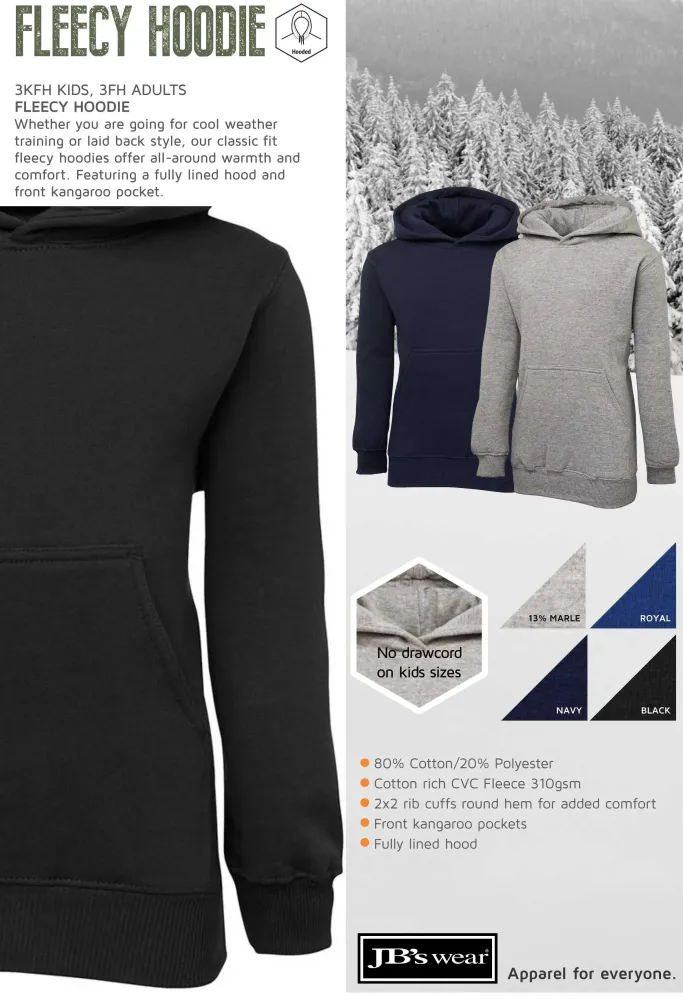 A classic fit pullover built from 310 GSM cotton rich CVC fleece for warmth and easy care. The fully lined hood and front kangaroo pocket add comfort and practicality, while 2x2 rib cuffs and hem help the hoodie keep its shape. JB’s Wear Kids Fleecy Hoodie 3KFH custom printed is a tidy choice for schools and clubs.