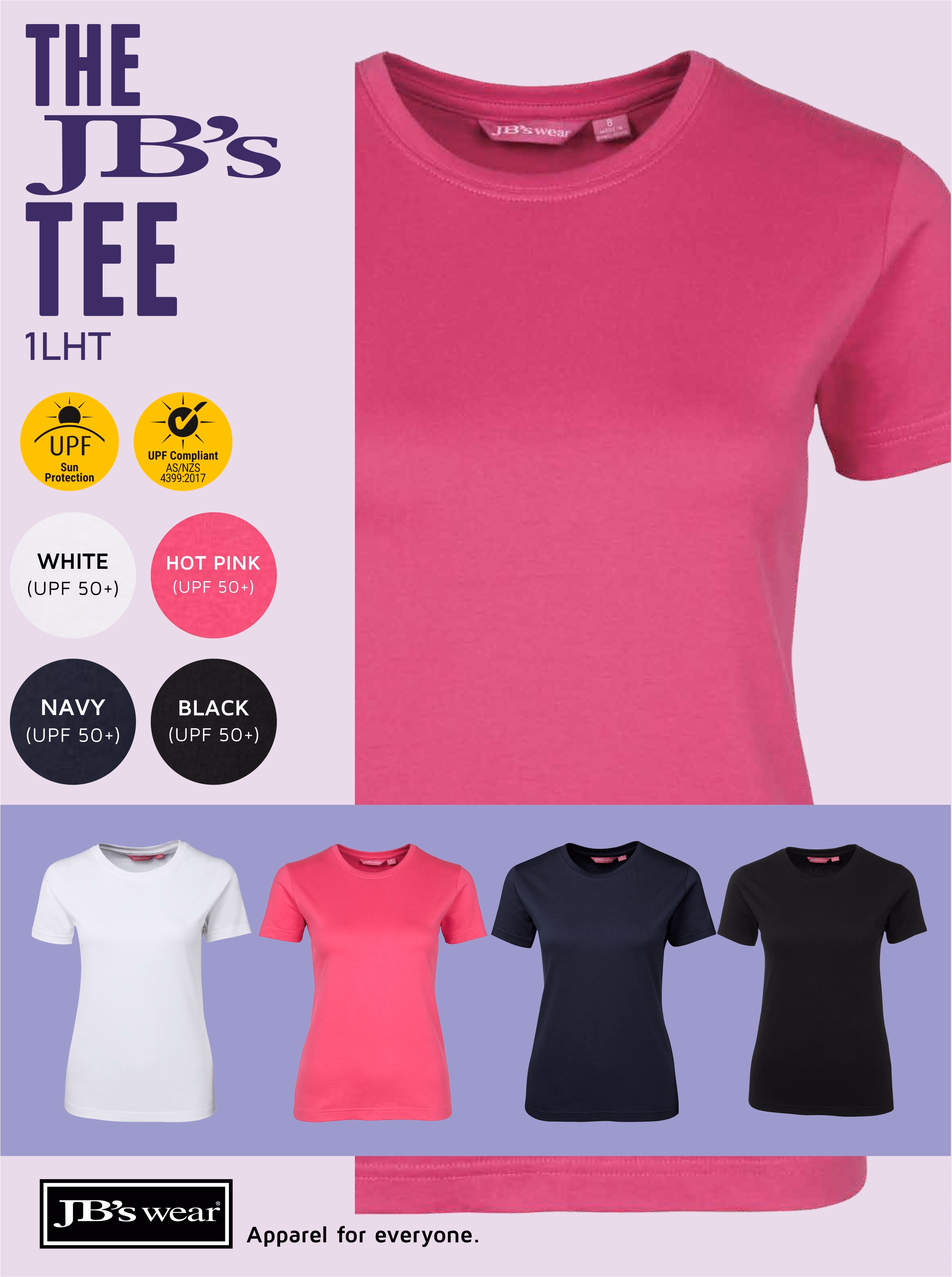 The JB’s Wear Ladies Tee 1LHT is a classic fit T-shirt designed for reliable everyday wear. It uses 165 GSM ring spun jersey knit for a soft hand and neat structure, finished with an elastane rib crew neck to help the neckline hold its shape. Vertical side seams are engineered to minimise twist, and the tee complies with AS 4399:2020 for UPF protection. Solid colours are 100% cotton.