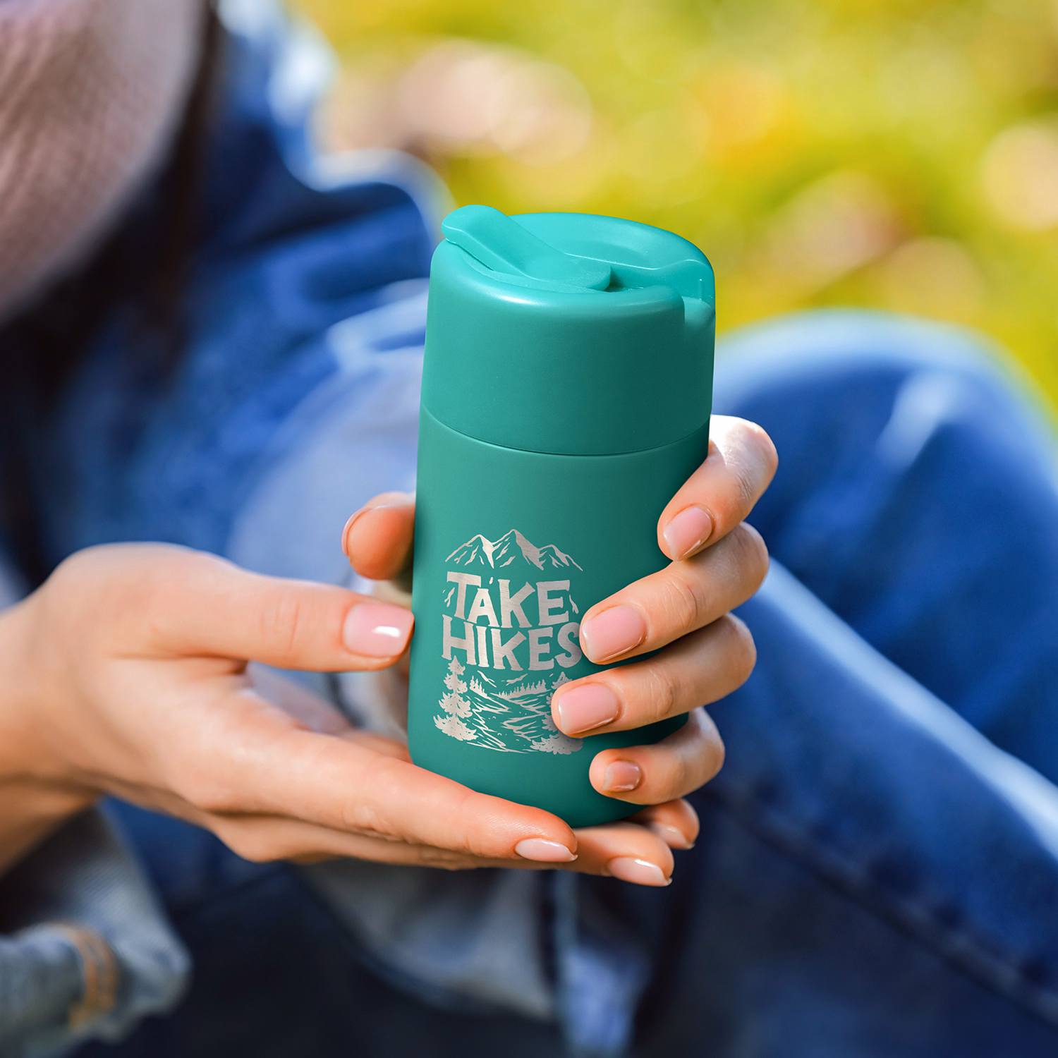 Vacuum-insulated stainless steel helps maintain temperature while the exterior stays comfortable to hold. A screw-on flip lid with a silicone seal provides a secure, splash-resistant close. The painted body and colour-matched lid create a streamlined, retail-style look. Branding on the body is available via pad print, rotary screen print, rotary digital print, or laser engraving; engraving reveals shiny steel for durable contrast. Each cup is supplied in a natural gift box for tidy presentation. Care is simple: hand wash is recommended to preserve the finish and branding.