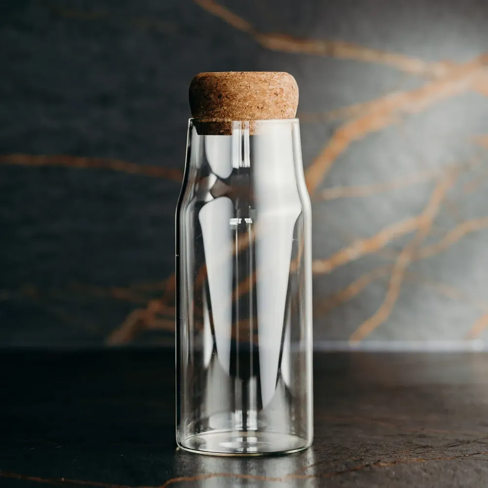 - Minimalist 800ml borosilicate glass carafe with natural push-on cork lid
