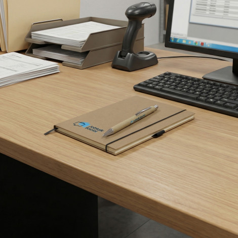 A coordinated notebook and pen set with a clean, natural look for everyday organisation. The medium-sized (approximately A5) notebook features a durable kraft cover, 80 leaves of lined cream paper made from sugarcane waste, an elastic closure band, and a pen loop. It is paired with a retractable Lancer Kraft Pen with a natural or black kraft paper barrel, shiny chrome trim, and 1200 metres of black Dokumental ink for smooth, reliable writing. The notebook and pen set is presented in a natural gift box.