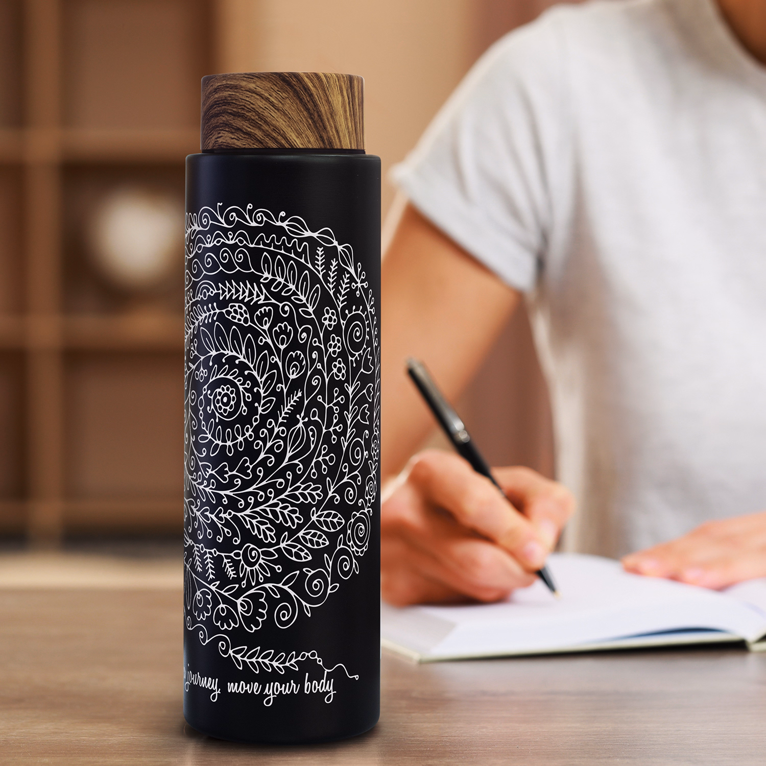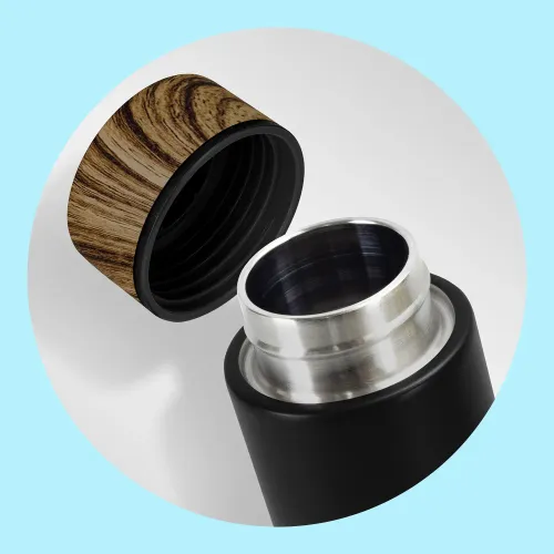 Medina is a 480 ml double-wall vacuum insulated stainless steel bottle with refined styling. It has a matte black painted body paired with a wood-grained water transfer lid for contrast. The secure screw-on lid includes a polypropylene inner and silicone seal. The BPA-free bottle is suitable for hot liquids. Branding options include pad print, rotary screen print, or laser engraving, with engraving producing a shiny steel finish. Medina is presented in a natural gift box. Hand washing is recommended to protect decoration.