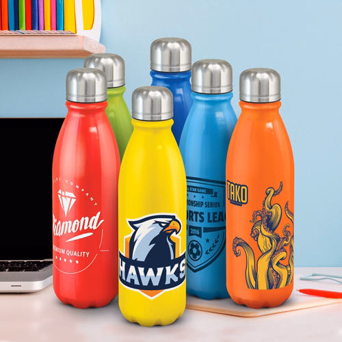 Mirage is a 750 ml single-wall aluminium bottle with a painted exterior. Coloured versions feature a gloss finish, while the silver option is matte. It has a stainless steel screw-on lid with a polypropylene inner and silicone seal. The BPA-free construction supports safe use. Branding options include pad print, rotary screen print, or vivid full-colour rotary digital. Supplied loose packed, the bottle can also be presented in an optional black gift box. Hand washing is recommended to maintain branding.