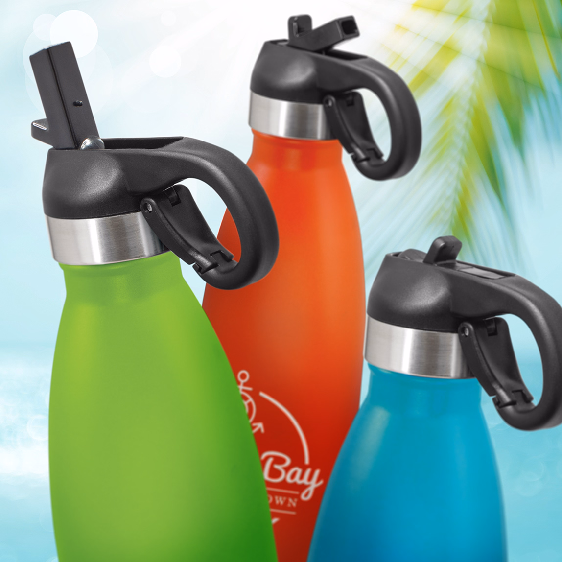 Mirage Powder Coated Flip Lid is a 500 ml vacuum insulated stainless steel bottle with a durable powder-coated finish. It maintains cold drinks for up to 24 hours. The screw-on polypropylene lid includes a flip-out drinking valve with straw for easy hydration. An integrated carry handle with spring-loaded carabiner clip provides added portability. Branding is available via pad print, rotary screen print, rotary digital full colour print, or laser engraving, with engraving producing a shiny steel finish. The BPA-free bottle is presented in an individual black gift box. Hand washing is recommended to protect decoration.