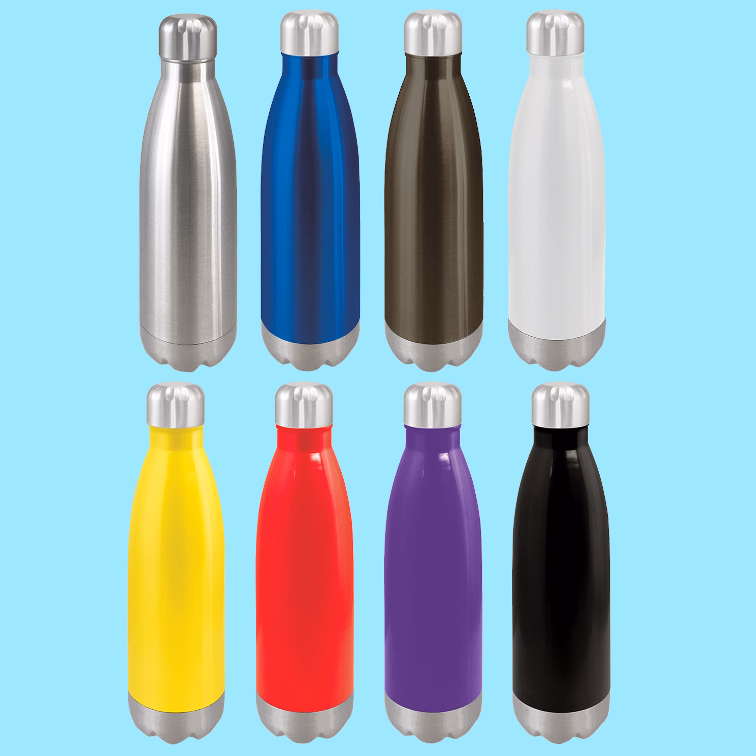 Gloss painted finish on colours; translucent painted finish on gunmetal and blue; silver bottle has shiny steel finish; engraving reveals shiny steel on colours and natural etch on silver.