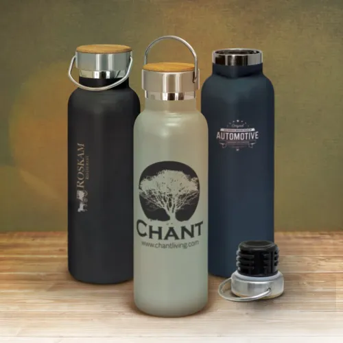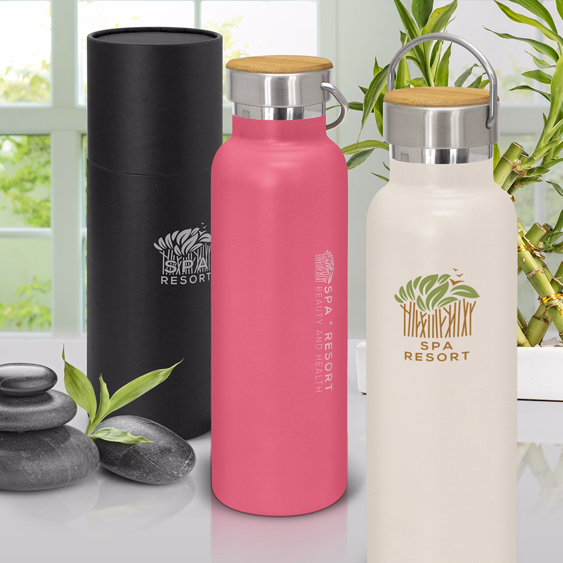 Nomad Deco Powder Coated is a 650 ml double-wall vacuum insulated stainless steel bottle with a durable matte powder-coated finish. It maintains cold drinks for up to 24 hours and hot for up to 12 hours. The screw-on lid has an integrated stainless steel carry handle and is available in either full stainless steel or with a bamboo veneer. Bamboo is a natural material and may show unique variances in grain, colour, and branding. Branding options include rotary screen print, rotary digital full colour print, pad print on the gift tube, or laser engraving, with engraving producing a shiny steel finish on the bottle and a natural etch on the lid. Nomad Deco is BPA-free and presented in a black gift box, with the option of a natural or black gift tube. Hand washing is recommended to protect decoration.