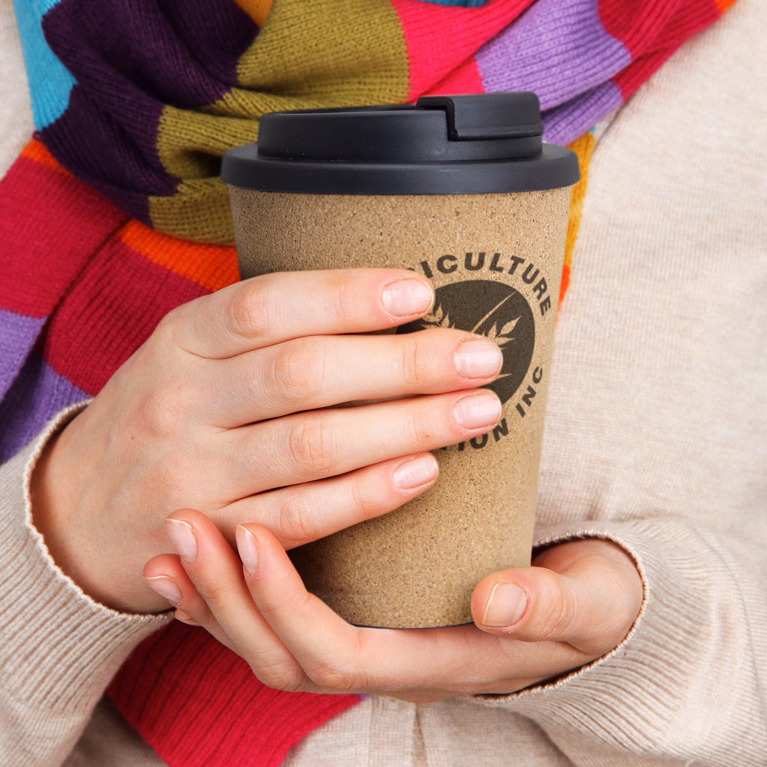 A practical double-wall build in polypropylene helps retain temperature and reduce exterior heat. The secure screw-on lid uses a splashproof flip closure for controlled sipping. A soft-touch natural cork outer adds warmth in hand and contributes to insulation. The aesthetic is clean and natural with a black lid for contrast. Branding is available on the body via pad print or bold rotary screen wrap. Hand washing is recommended to protect materials and decoration.