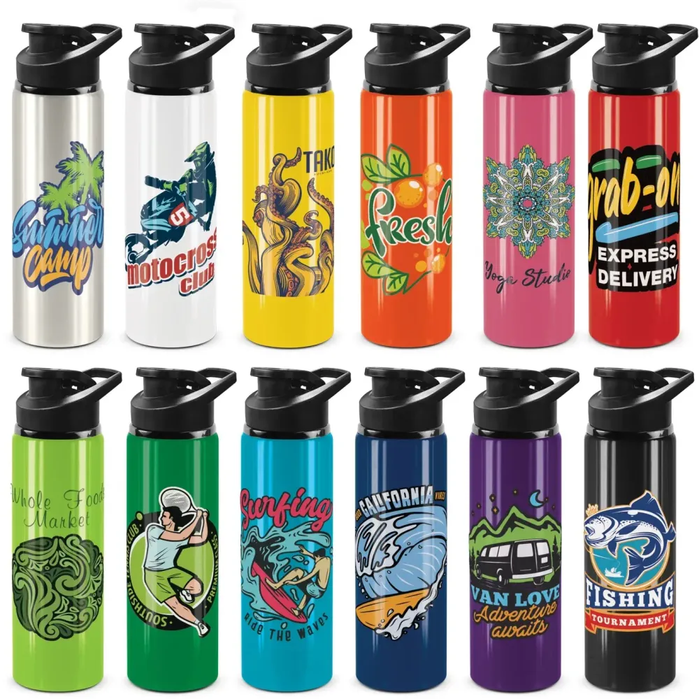 Oasis is a 750 ml single-wall aluminium bottle with a painted finish. It features a secure screw-on lid with a leakproof snap cap. A carry handle is integrated into the lid. Coloured bottles have a gloss painted finish, while the silver bottle has a shiny steel finish. The construction is BPA-free. Branding is available via pad print, rotary screen print, or full-colour rotary digital. Hand washing is recommended to protect printed decoration.