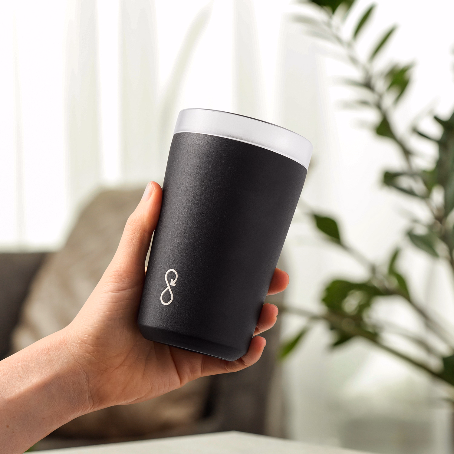 From Ocean Bottle, this vacuum-insulated tumbler combines performance with a verified impact model. Double-wall stainless steel keeps drinks warm for six hours and cold for eighteen. The push-on lid has a smooth sliding closure and a silicone seal for confident use. A powder-coated Obsidian Black finish provides a refined, durable surface. The form fits standard car cupholders and slips under barista machines. Each Ocean Bottle sale funds the removal of 11.4 kg of ocean-bound plastic. Branding on the body is by laser engraving, and each tumbler is supplied in an Ocean Bottle gift box.