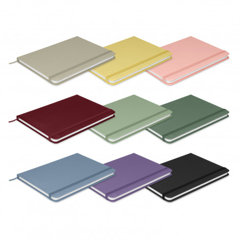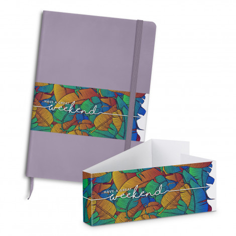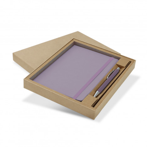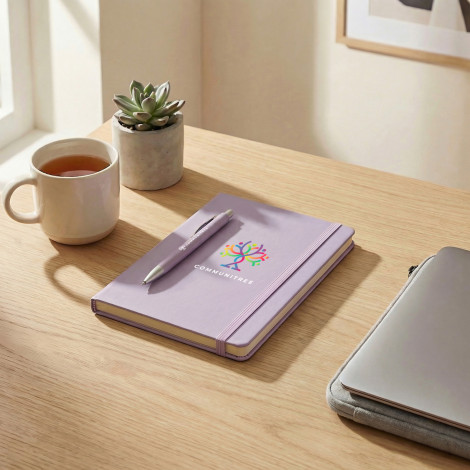 A stylish, coordinated notebook and pen gift set available in a range of trendy fashion colours and presented in a natural gift box. The medium-sized (approximately A5) Omega Notebook features a durable PU hard cover, 80 leaves of lined white paper, and a matching elastic closure with bookmark ribbon. It is paired with an attractive Lancer Fashion Pen with a matte lacquered recycled aluminium barrel, matte silver trim, and 800 metres of black Dokumental ink for smooth, dependable writing. An optional paper belly band is available on request and can be branded in full colour. Colour matched and presented in a natural gift box.
