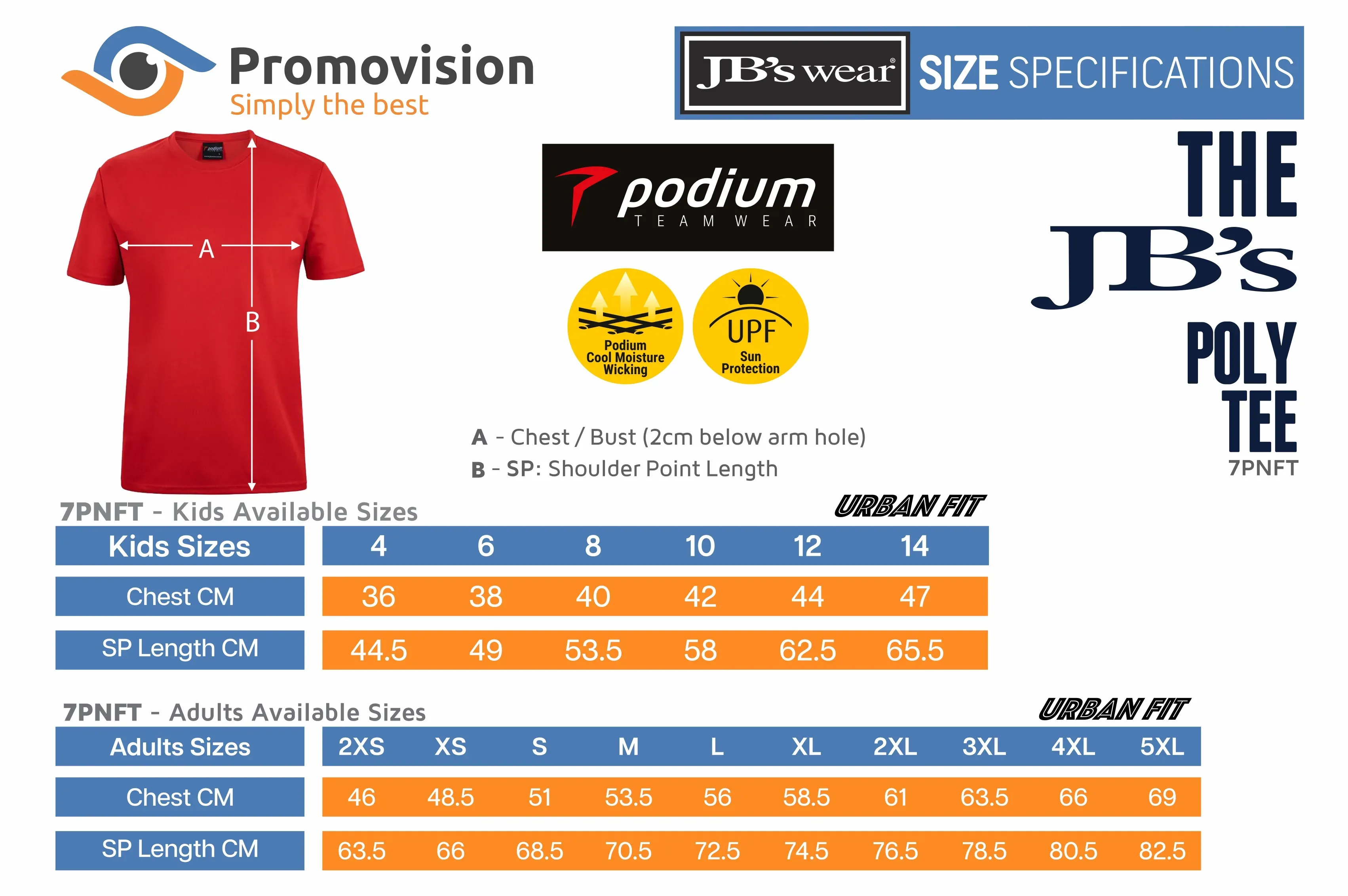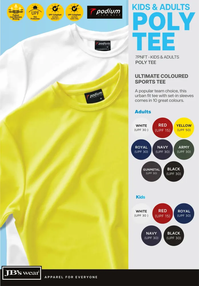 The JB’s Wear Podium Kids & Adults Poly Tee 7PNFT is a performance T-shirt in 160 GSM polyester pique knit with Podium Cool moisture wicking to help keep you cool and dry. The urban fit sits neat without feeling tight, the easy care, quick drying fabric is practical for active use, and it complies with AS 4399:2020 for UPF protection.