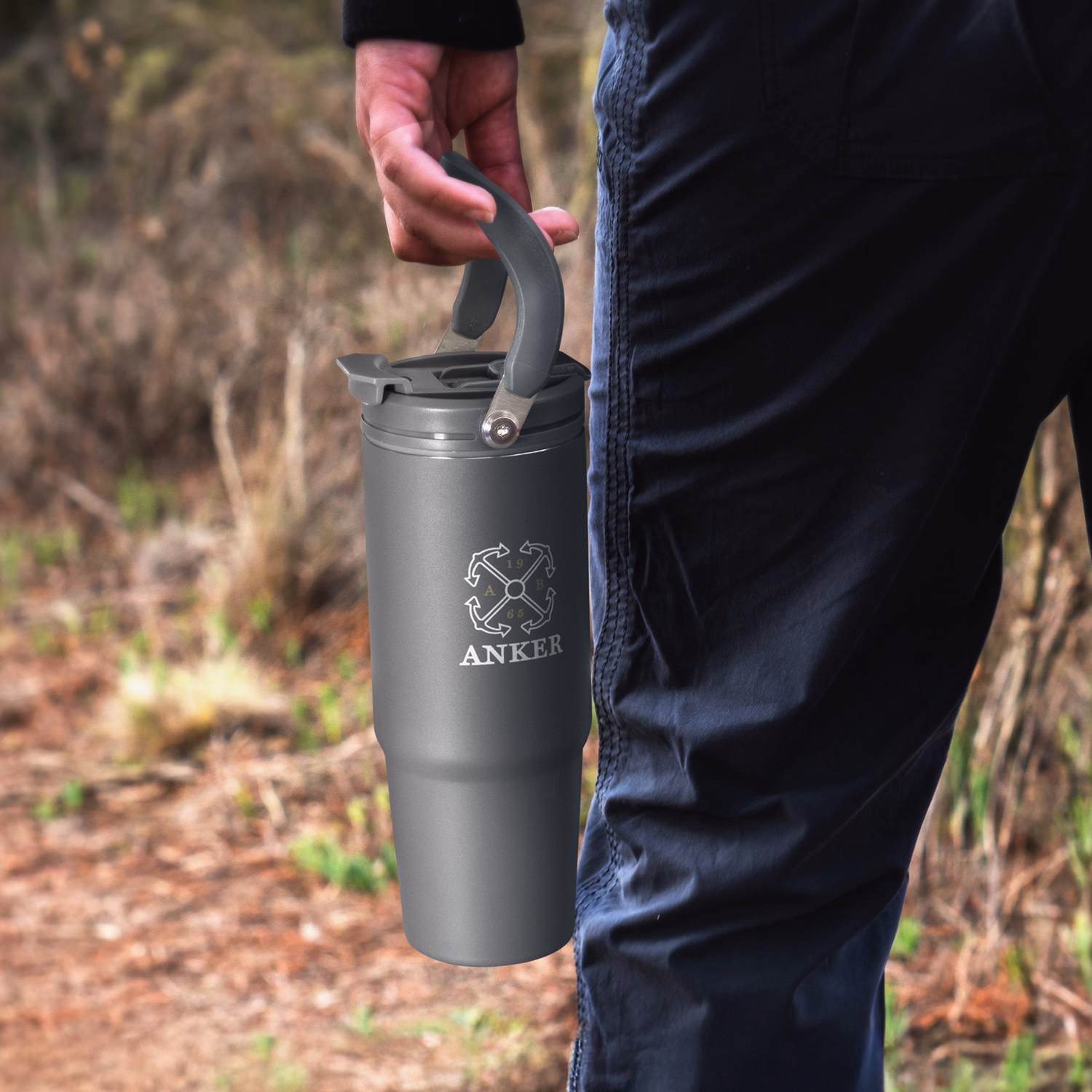 Sentry is an extra-large 900 ml vacuum insulated stainless steel mug designed for durability and versatility. It has a tough powder-coated finish and a secure screw-on lid with two drinking options: a flip valve with straw for cold drinks and a flip closure for hot beverages. The removable straw ensures safe use with hot liquids. A large ergonomic polypropylene handle adds comfort and practicality. Branding options include pad print or laser engraving, with engraving producing a shiny steel finish. Each BPA-free mug is presented in a natural kraft gift box. Hand washing is recommended to protect decoration.