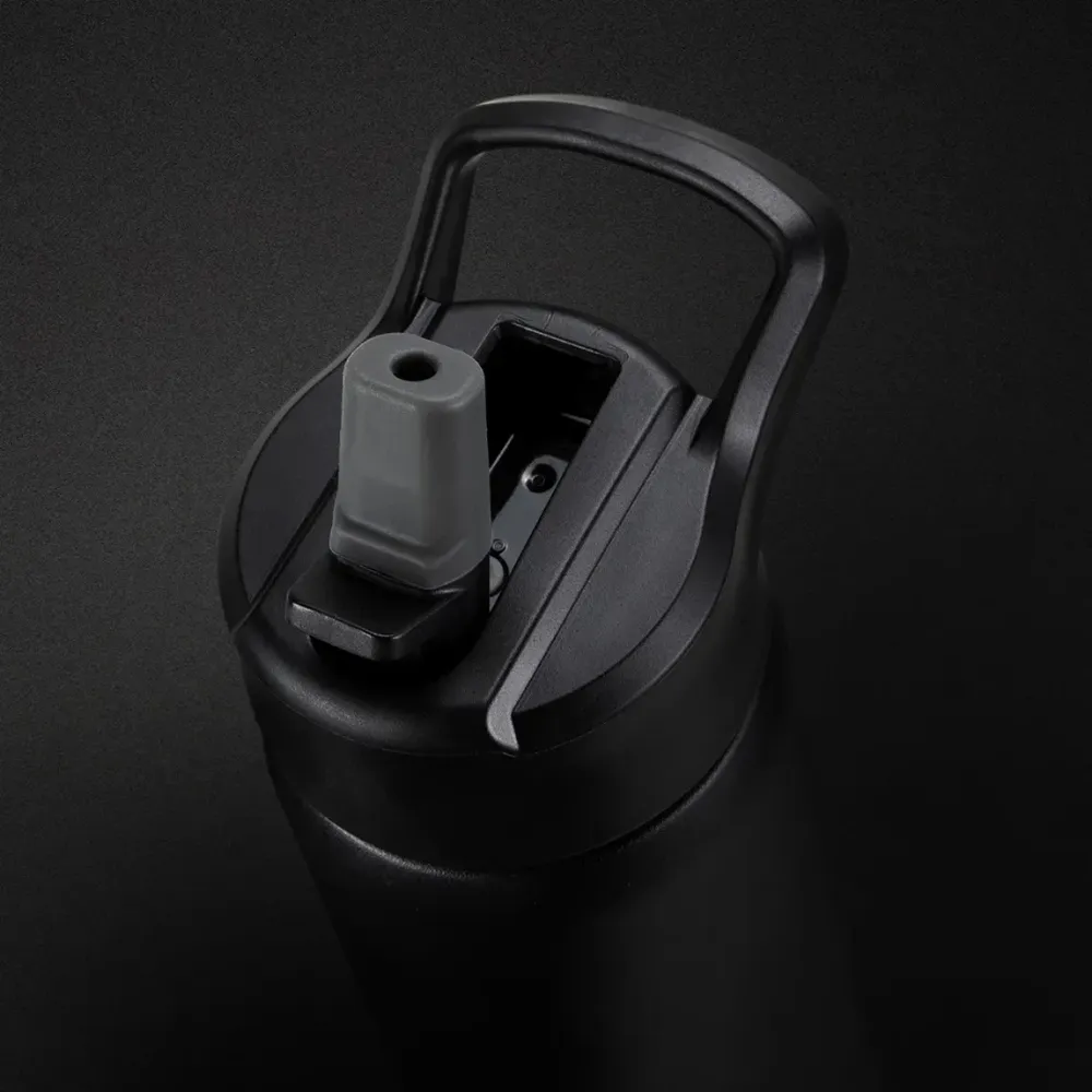 Screw-on lid with carry handle; flip-out valve and removable silicone mouthpiece.