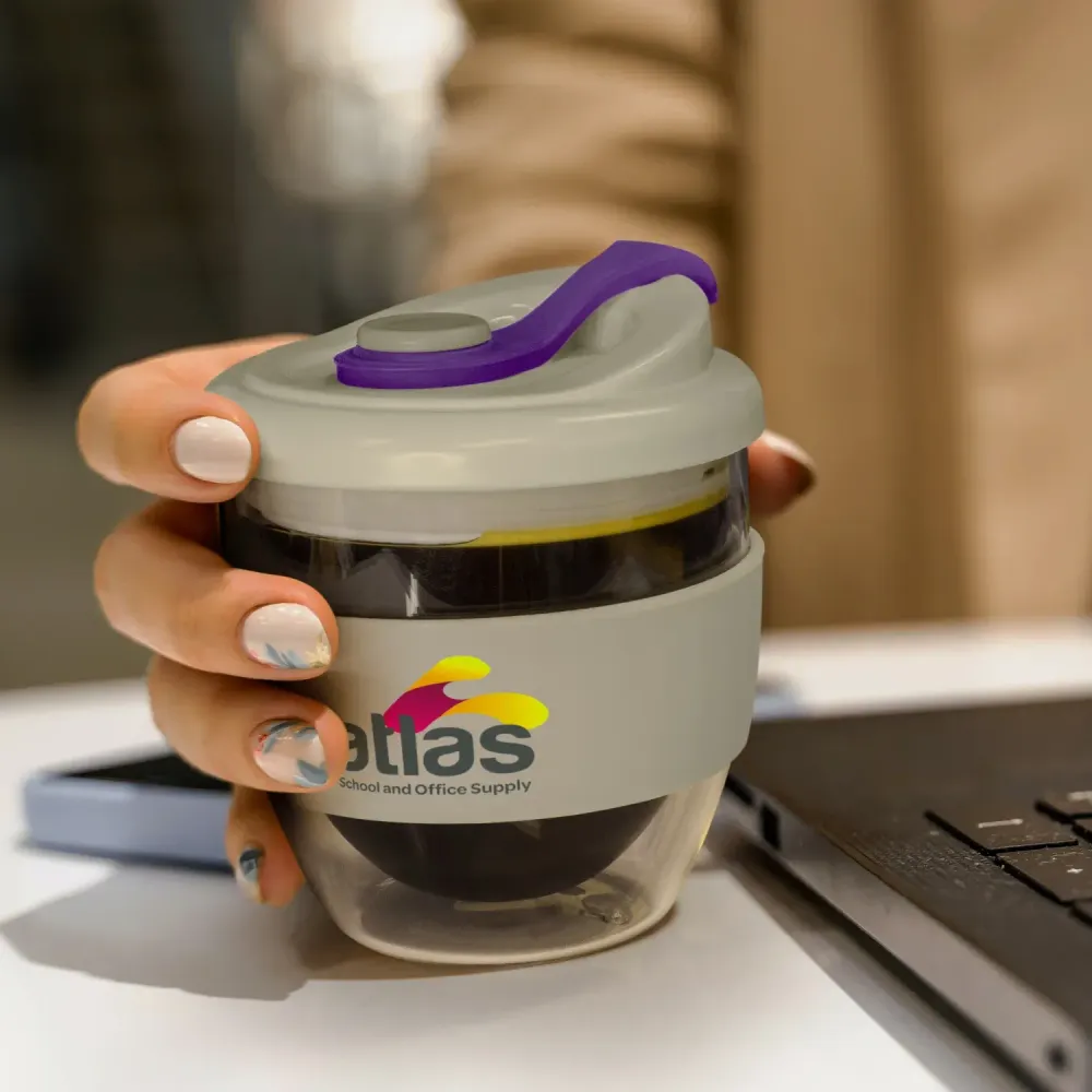 Double-wall borosilicate glass helps keep drinks hotter for longer while the exterior stays comfortable to hold. The push-on polypropylene lid with silicone swivel closure secures the sip point. A clear glass body and broad silicone band give a sophisticated, contemporary look. Branding is available on the silicone band via pad print, rotary screen print, silicone digital, or debossed marks. Mix and match swivel colours to align with brand palettes. Supplied in a natural gift box for tidy presentation.