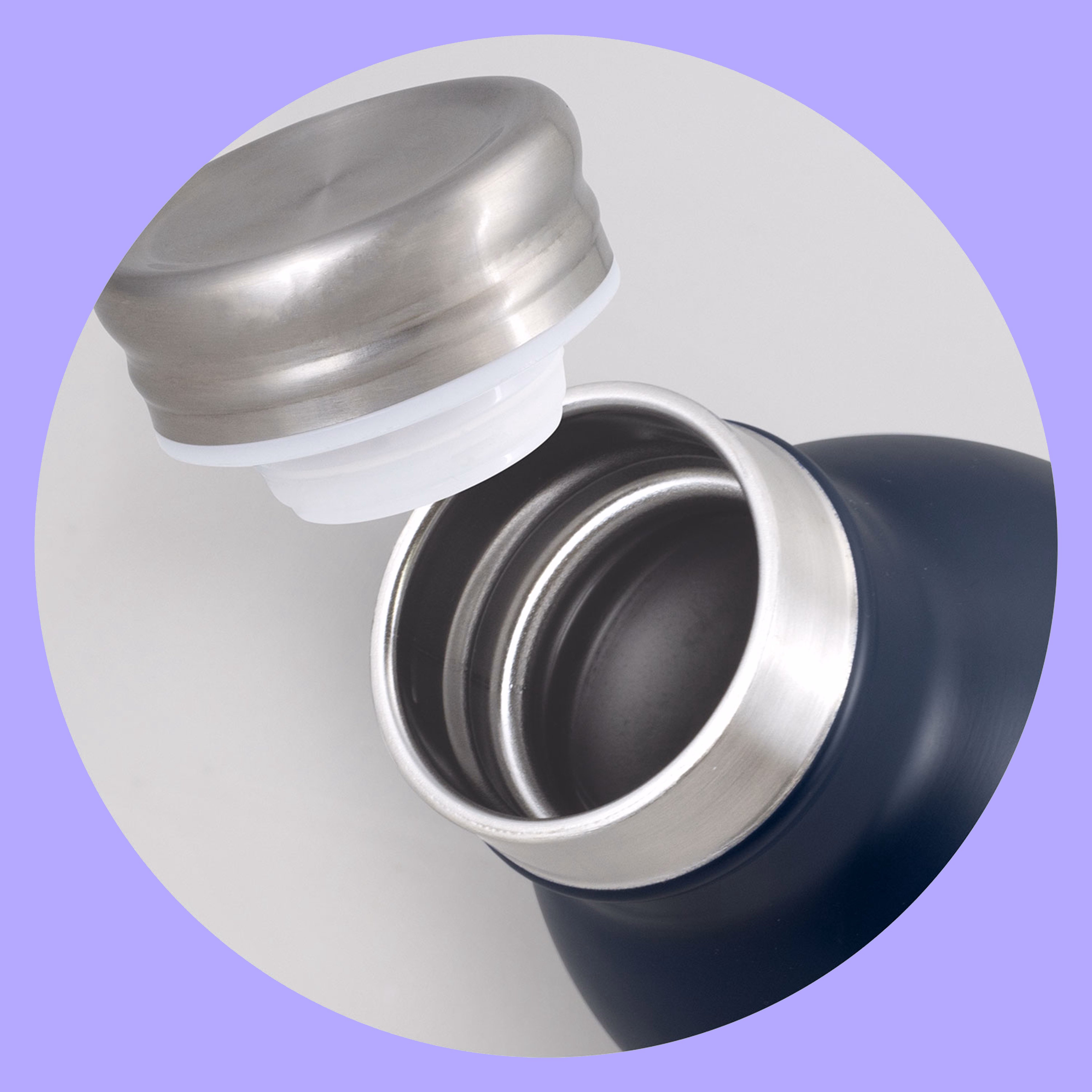 Double-wall vacuum insulation suitable for hot liquids; not for carbonated drinks.