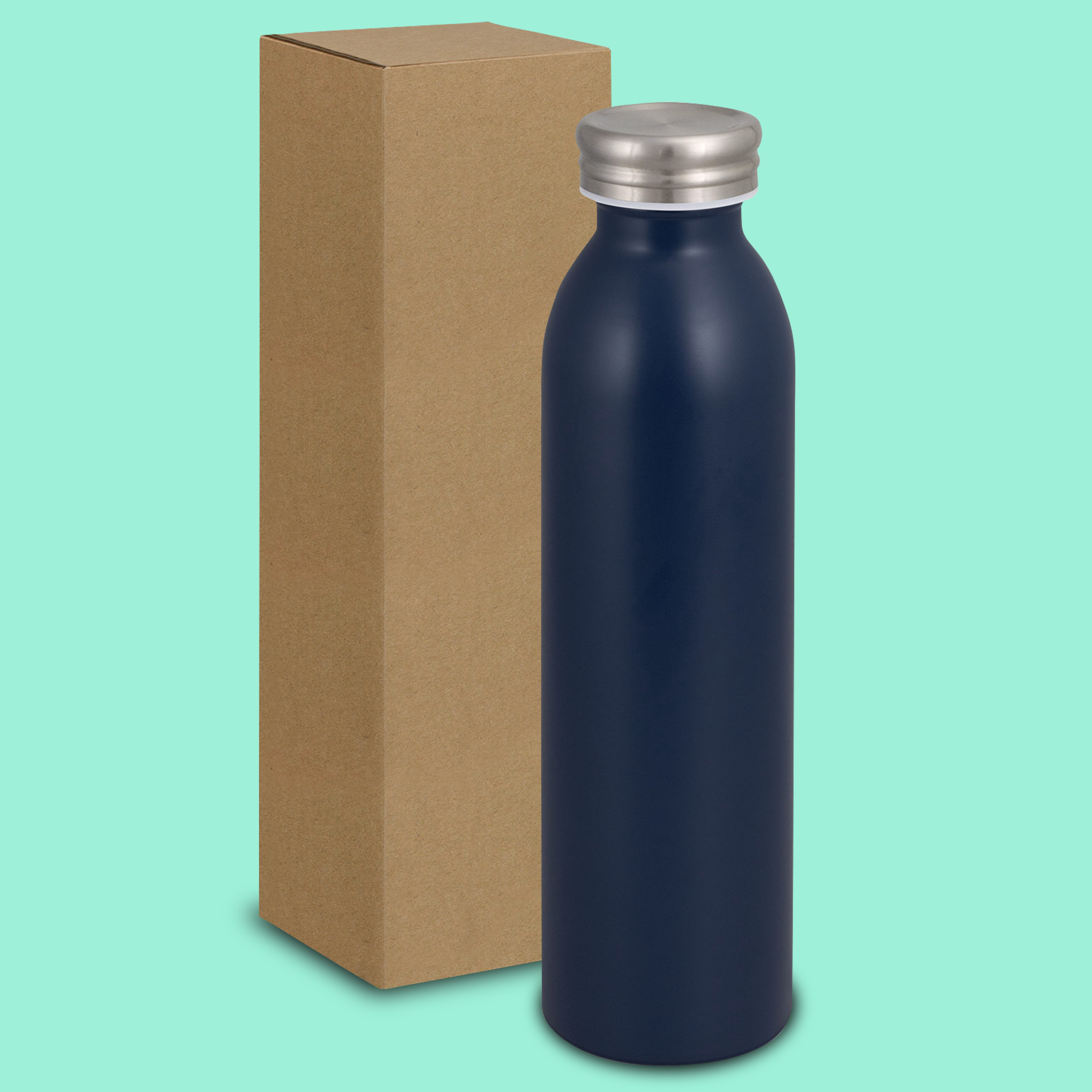 Vanguard is a 600 ml stainless steel bottle with double-wall vacuum insulation. It features a painted finish and a secure stainless steel screw-on lid with a white polypropylene trim and silicone seal. The bottle keeps drinks hot or cold for extended periods and is BPA-free. Branding options include pad print, screen print, rotary digital full colour print, or laser engraving. Engraving reveals a shiny steel finish. Each bottle is presented in a natural kraft gift box. Hand washing is recommended to preserve printed or engraved decoration.