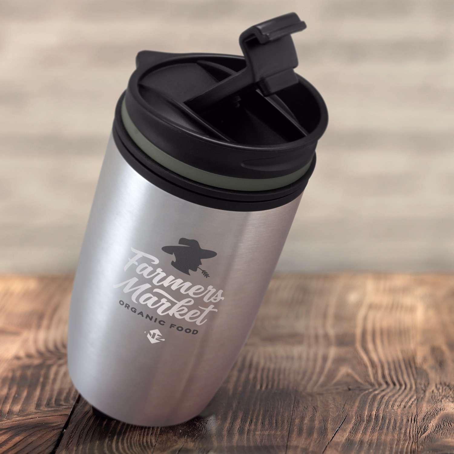 A compact double-wall build pairs a stainless outer with a polypropylene inner to slow heat transfer. The secure screw-on lid uses a smooth flip closure for controlled sipping. A refined shiny-steel body on the stainless model contrasts with painted black or white options. The soft, non-marking base helps protect surfaces and adds stability. Branding is available on the body via pad print, rotary digital full colour, or laser engraving; engraving etches to shiny steel on coloured cups and a natural finish on stainless. An optional natural gift box and printable sleeve complete the presentation.