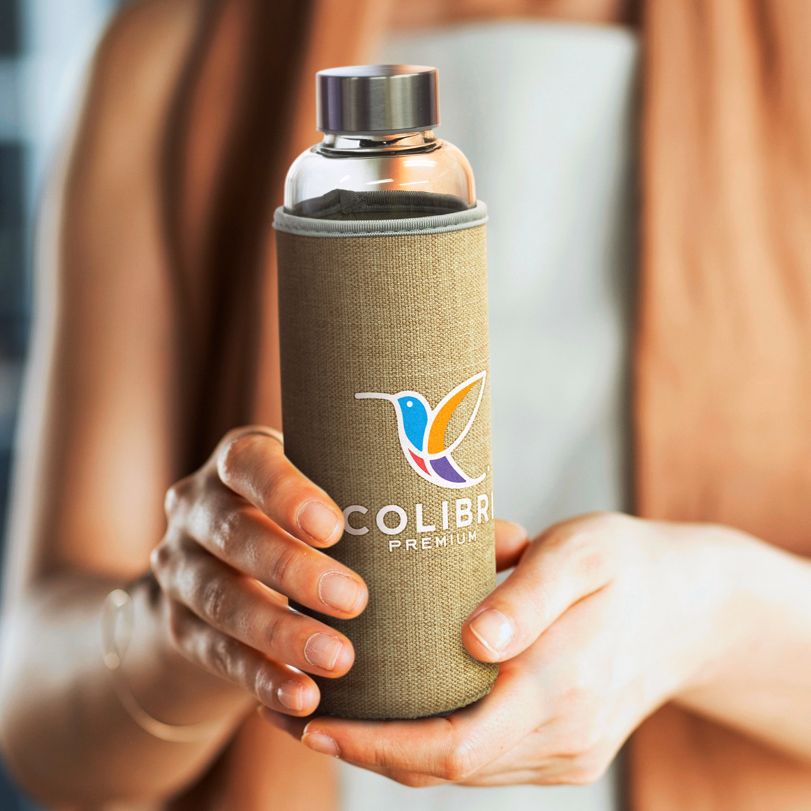 Venus is a deluxe 600ml borosilicate glass drink bottle with a soft poly jute sleeve. The sleeve features a fashion-inspired textured polyester outer that adds a refined, natural look. A secure screw-on stainless steel lid can be laser engraved with a logo. Borosilicate glass is lightweight, exceptionally strong and shatter-resistant, and glass offers a clean, pure taste as a safe, reusable alternative to plastic. Use for cold liquids only; it is not suitable for hot or carbonated drinks. Each bottle is supplied in a white gift box, with an optional natural or black gift tube available. Hand washing is recommended; the bottle is not dishwasher safe.