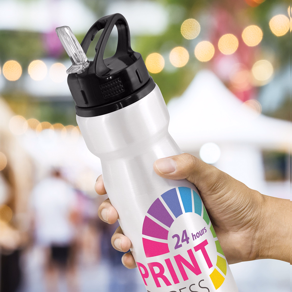Viper is a 750 ml single-wall aluminium bottle with a painted finish. The screw-on lid includes a flip valve and integrated straw for easy drinking. A moulded carry handle is built into the lid. Coloured bottles have a gloss painted finish, while the silver bottle has a shiny steel finish. Constructed from BPA-free materials, the bottle is supplied loose packed with optional presentation in a gift box and sleeve. Branding is offered via pad print, rotary screen print, and vivid full-colour rotary digital. Hand washing is recommended to maintain branding quality.