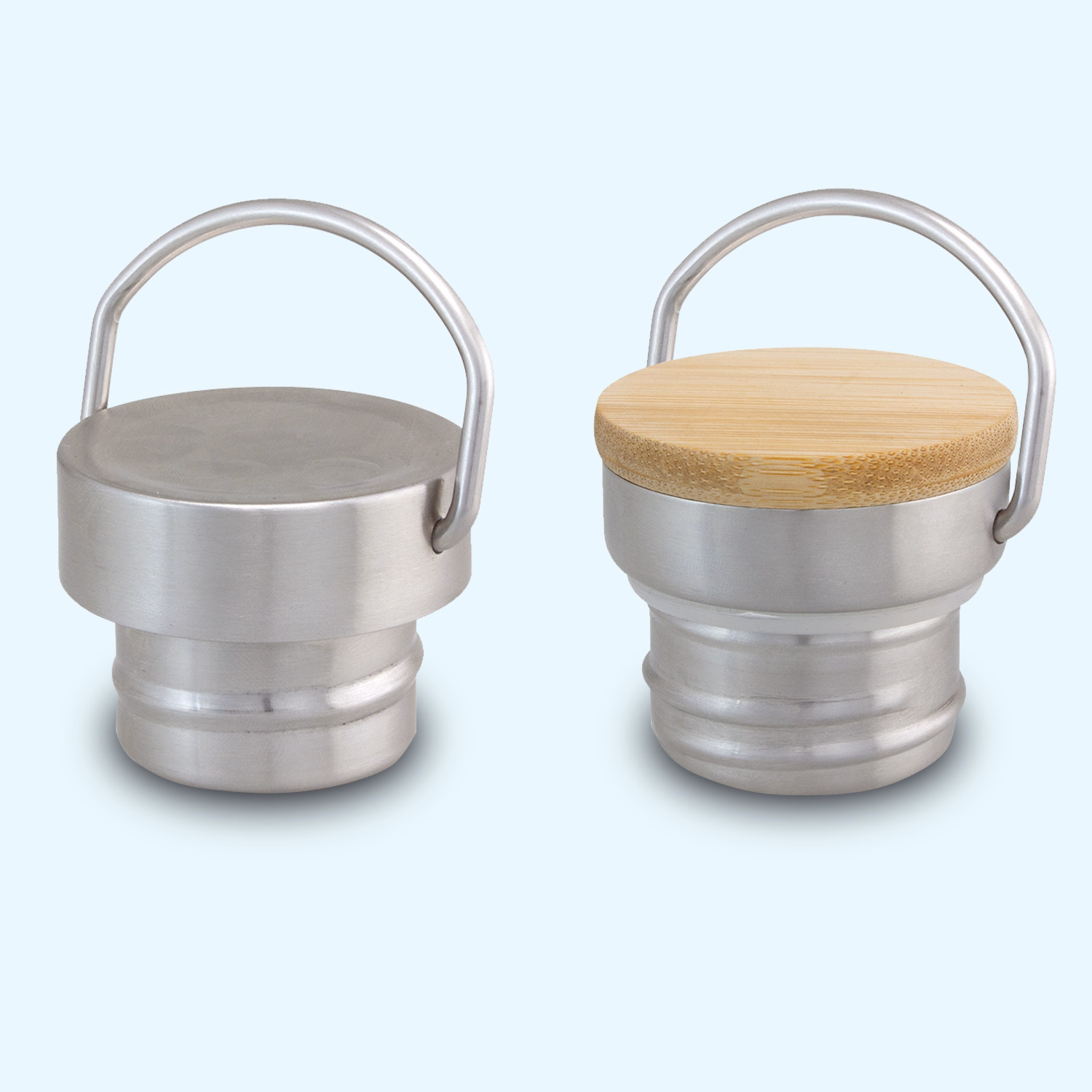 Threaded lid with integrated stainless steel carry handle; optional bamboo veneer detail.