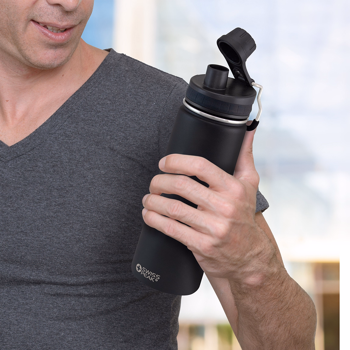 Swiss Peak Vacuum Bottle is a premium 700 ml design crafted from stainless steel with double-wall, vacuum insulation. It maintains drinks cold for 24 hours or hot for up to 12 hours. The screw-on lid includes a silicone ring for smooth opening, a flip closure, and a sturdy metal carry handle with soft-touch silicone grip. Finished in a tough powder coat, this BPA-free bottle engraves beautifully to a polished steel finish. Each bottle is presented in a Swiss Peak branded gift box with information leaflet, reinforcing its premium positioning as a corporate gift. Branding is available via pad print or laser engraving.
