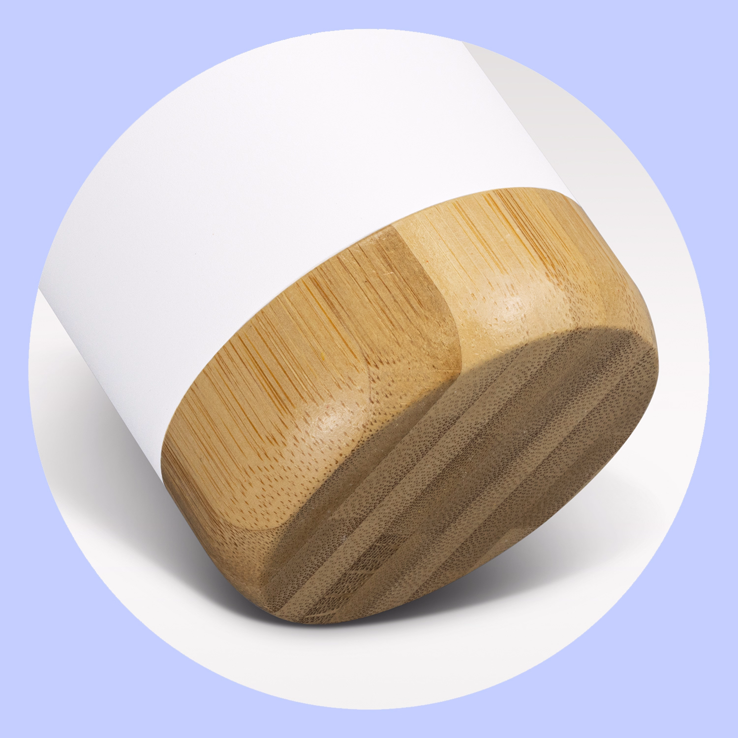 Nomad Bambino is a 650 ml vacuum insulated stainless steel bottle with a tough powder-coated finish. It maintains cold drinks for up to 24 hours and hot for up to 12 hours. The screw-on stainless steel lid features a natural bamboo trim and integrated carry handle, paired with a bamboo base for a refined look. As bamboo is a natural material, each piece will show unique grain and colour variances. Branding is available via pad print, rotary screen print, rotary digital full colour print, or laser engraving, with engraving producing a shiny steel finish. Each bottle is BPA-free and supplied in a natural gift box, with the option of a natural or black gift tube. Hand washing is recommended to protect decoration.