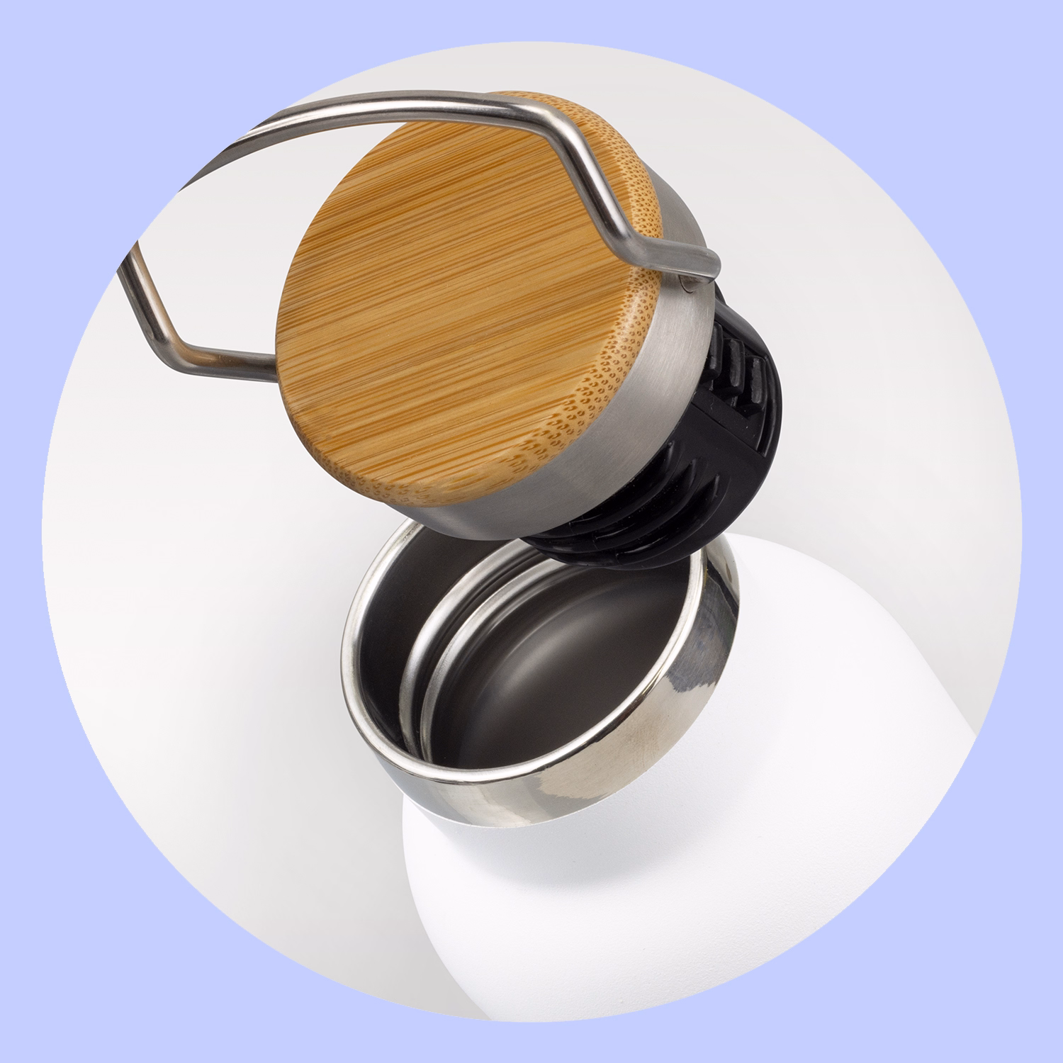 Threaded stainless steel lid with bamboo trim and integrated carry handle; silicone seal for secure closure.