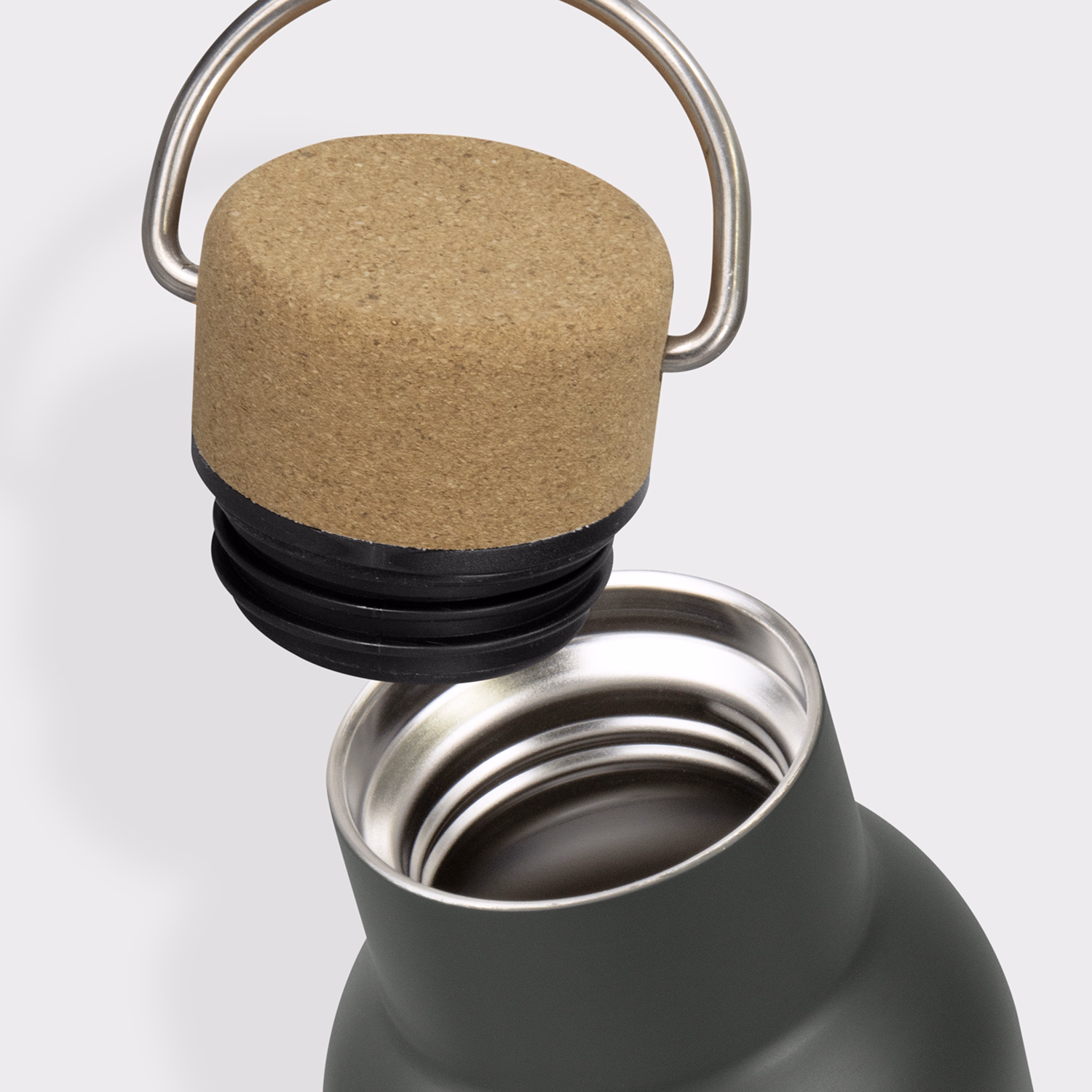 Threaded cork lid with polypropylene core and silicone seal; carry handle included.